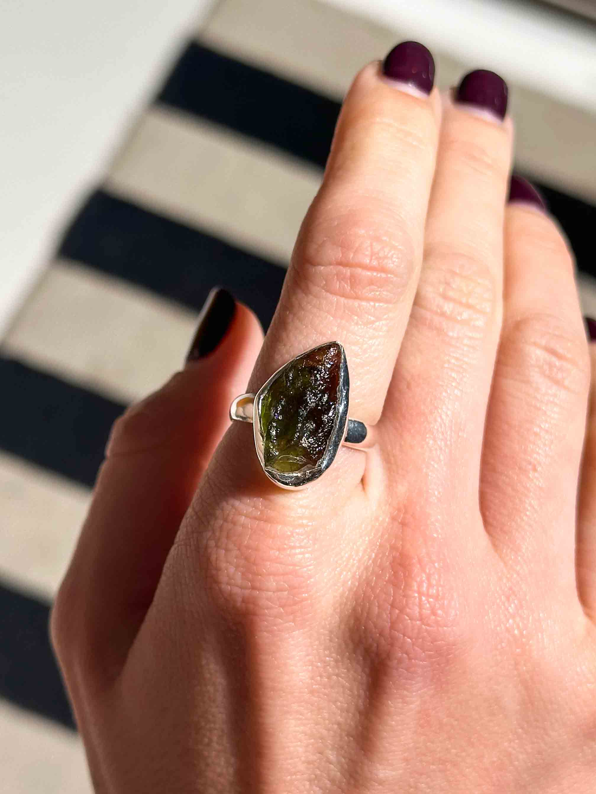 Κρατήστε τη δύναμη του σύμπαντος στα χέρια σας. Αυτό το χειροποίητο δαχτυλίδι από Ασήμι 925 αγκαλιάζει έναν αυθεντικό, ακατέργαστο Μολδαβίτη, τον πιο περιζήτητο τεκτίτη στον κόσμο.