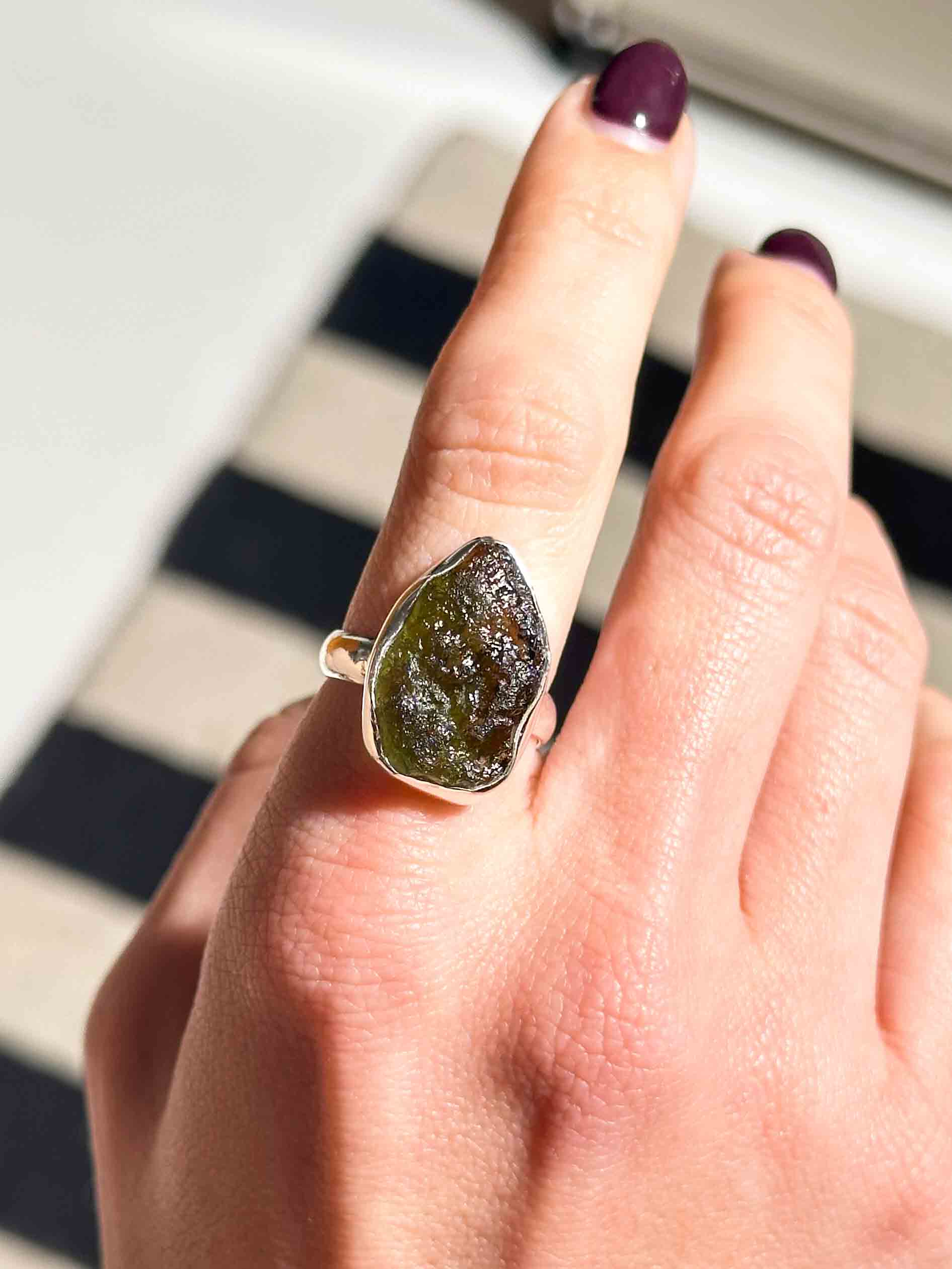 Κρατήστε τη δύναμη του σύμπαντος στα χέρια σας. Αυτό το χειροποίητο δαχτυλίδι από Ασήμι 925 αγκαλιάζει έναν αυθεντικό, ακατέργαστο Μολδαβίτη, τον πιο περιζήτητο τεκτίτη στον κόσμο.