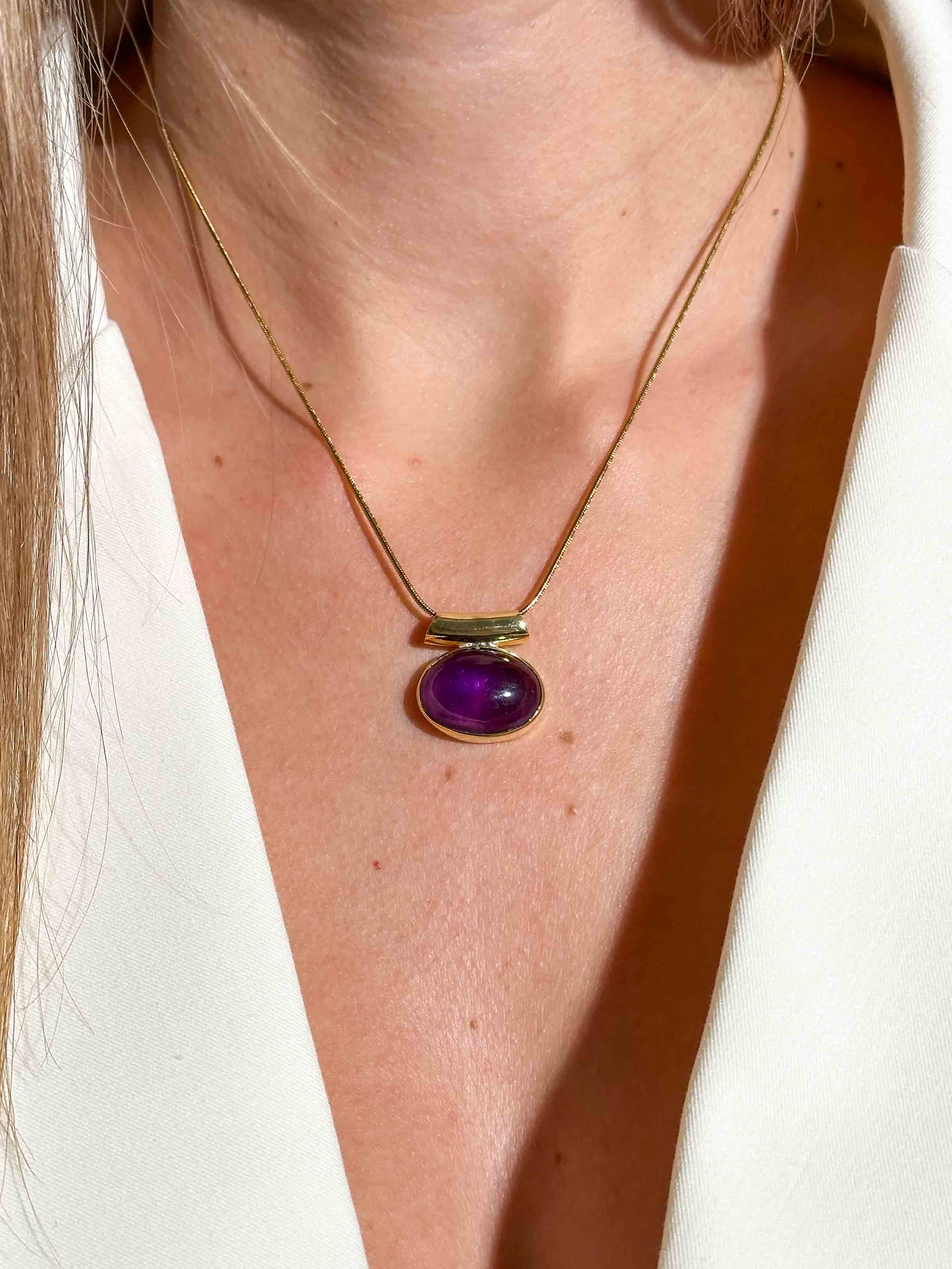Ένα κομψό και διαχρονικό κόσμημα που συνδυάζει την λάμψη του χρυσού με την μυστικιστική ενέργεια του Αμέθυστου. Ο αμέθυστος θεωρείται πέτρα ηρεμίας και πνευματικής διαύγειας· βοηθά στη χαλάρωση του νου, στην ενίσχυση της διαίσθησης και στην προστασία από την αρνητική ενέργεια. Ιδανικό για όσους αναζητούν εσωτερική γαλήνη και αρμονία στην καθημερινότητα.