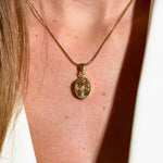 Το μενταγιόν συνοδεύεται από χρυσή ατσάλινη αλυσίδα, για να το φορέσεις αμέσως. Λόγω της επιχρύσωσης, χρειάζεται ιδιαίτερη φροντίδα ώστε να διατηρήσει τη λάμψη και την ανθεκτικότητά του με τον χρόνο.