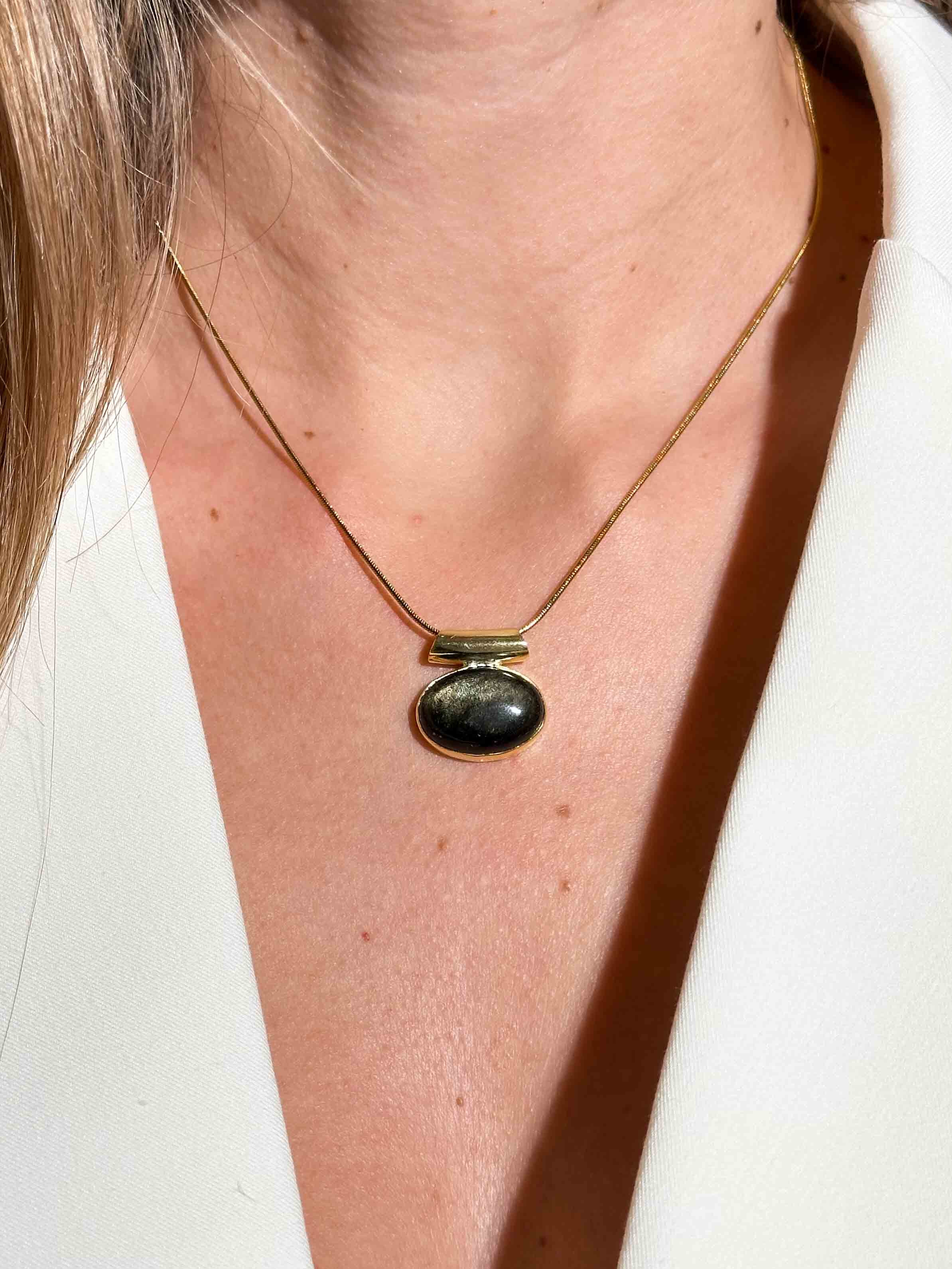 Ένα εκλεπτυσμένο κόσμημα που συνδυάζει τη ζεστή λάμψη του χρυσού με την έντονη ενέργεια του Χρυσού Οψιδιανού. Ο χρυσός οψιδιανός είναι πέτρα προστασίας και γείωσης· απομακρύνει την αρνητική ενέργεια, ενισχύει την εσωτερική δύναμη και βοηθά στην αποκάλυψη της αλήθειας. Φοριέται ως φυλαχτό για σιγουριά, αποφασιστικότητα και ενεργειακή θωράκιση.
