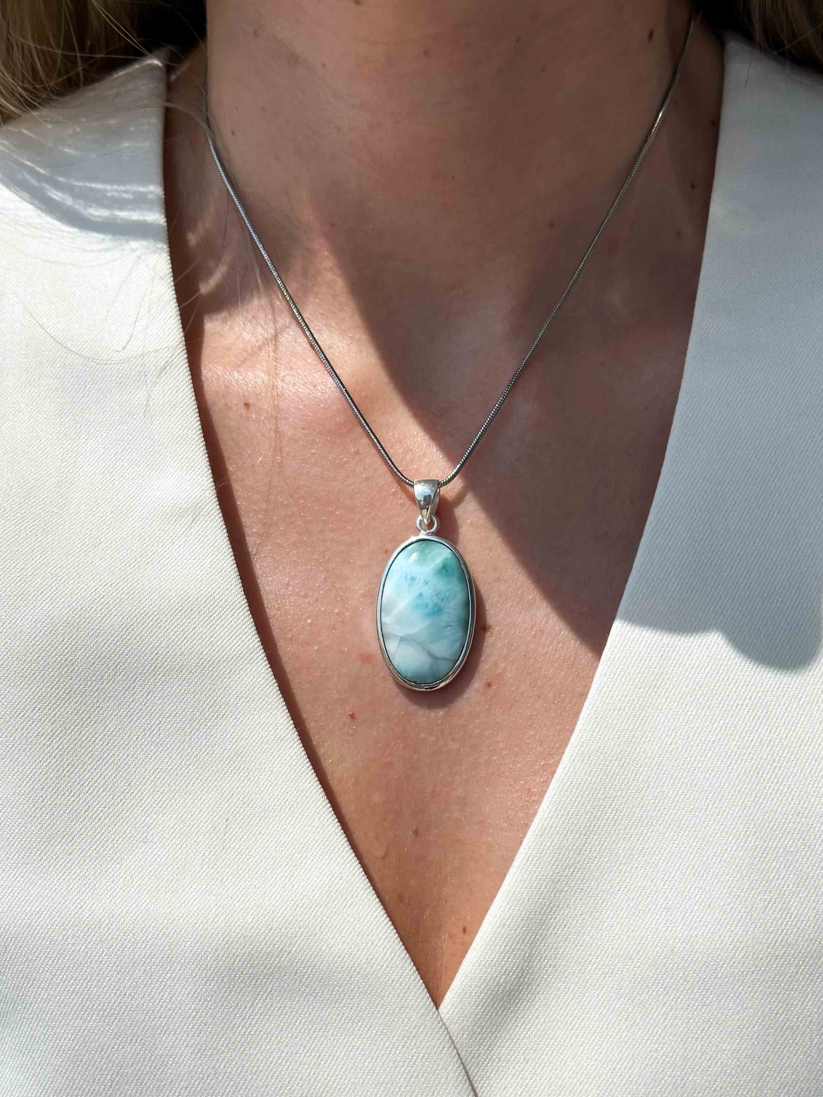 Ανακάλυψε την γαλήνη του ωκεανού μέσα σου, φορώντας αυτό το μοναδικό μενταγιόν Λάριμαρ. Ο Λάριμαρ, γνωστός και ως «Πέτρα του Δελφινιού», είναι ο κρύσταλλος της ηρεμίας, της καθαρής επικοινωνίας και της συναισθηματικής ισορροπίας. Καταπραΰνει το άγχος, φέρνει ευελιξία στο νου και σε συνδέει με την ενέργεια του νερού.