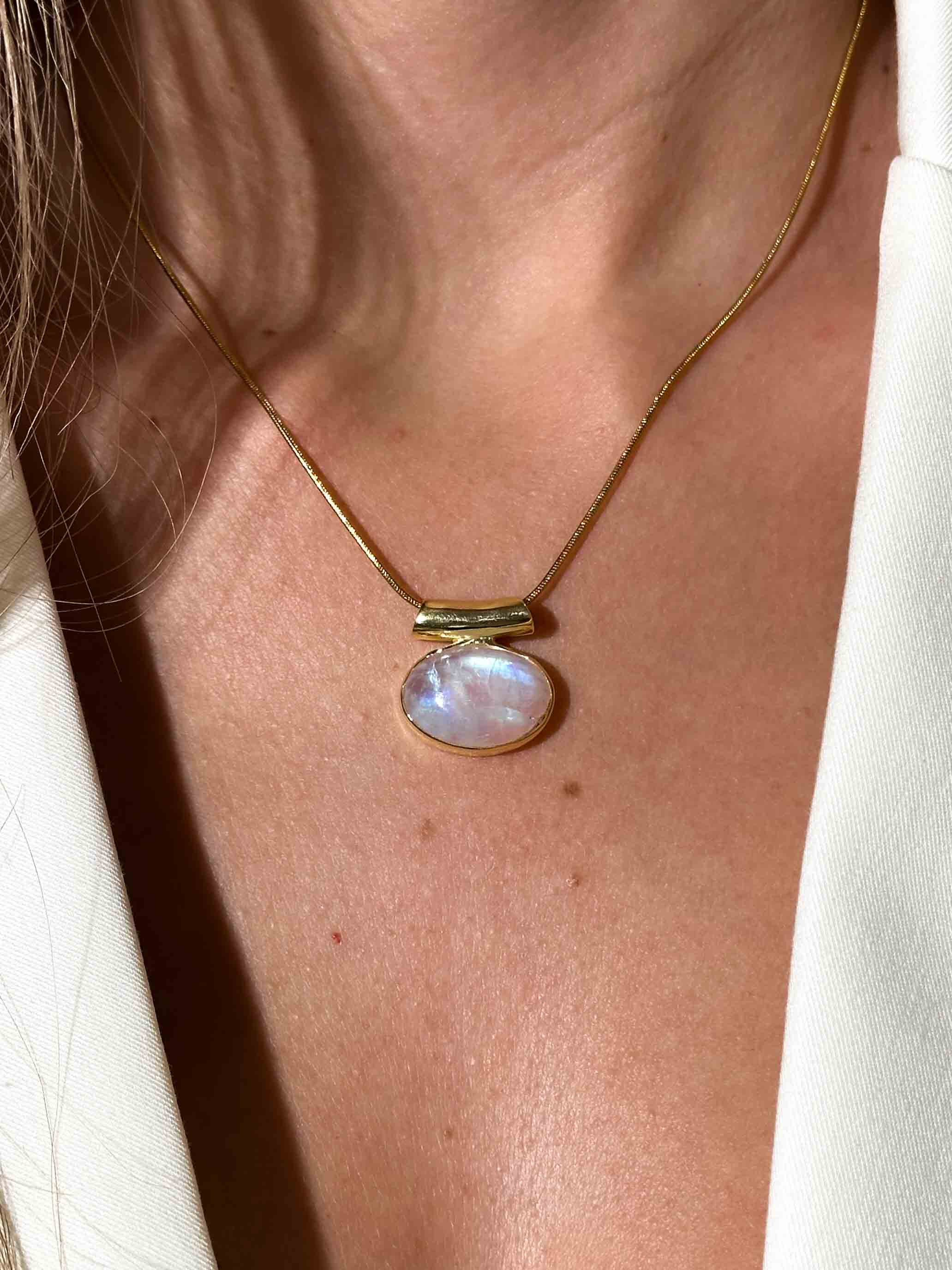 Ένα μαγευτικό κόσμημα που συνδυάζει την εκλεπτυσμένη λάμψη του χρυσού με την παιχνιδιάρικη φωτεινότητα της Φεγγαρόπετρας Rainbow. Η φεγγαρόπετρα θεωρείται πέτρα γυναικείας ενέργειας, διαίσθησης και συναισθηματικής ισορροπίας· ενισχύει τη διαύγεια, την έμπνευση και την εσωτερική γαλήνη, ενώ χαρίζει μία διακριτική λάμψη που αλλάζει με το φως. Ιδανικό για όσους θέλουν να συνδυάσουν κομψότητα και μυστικισμό.