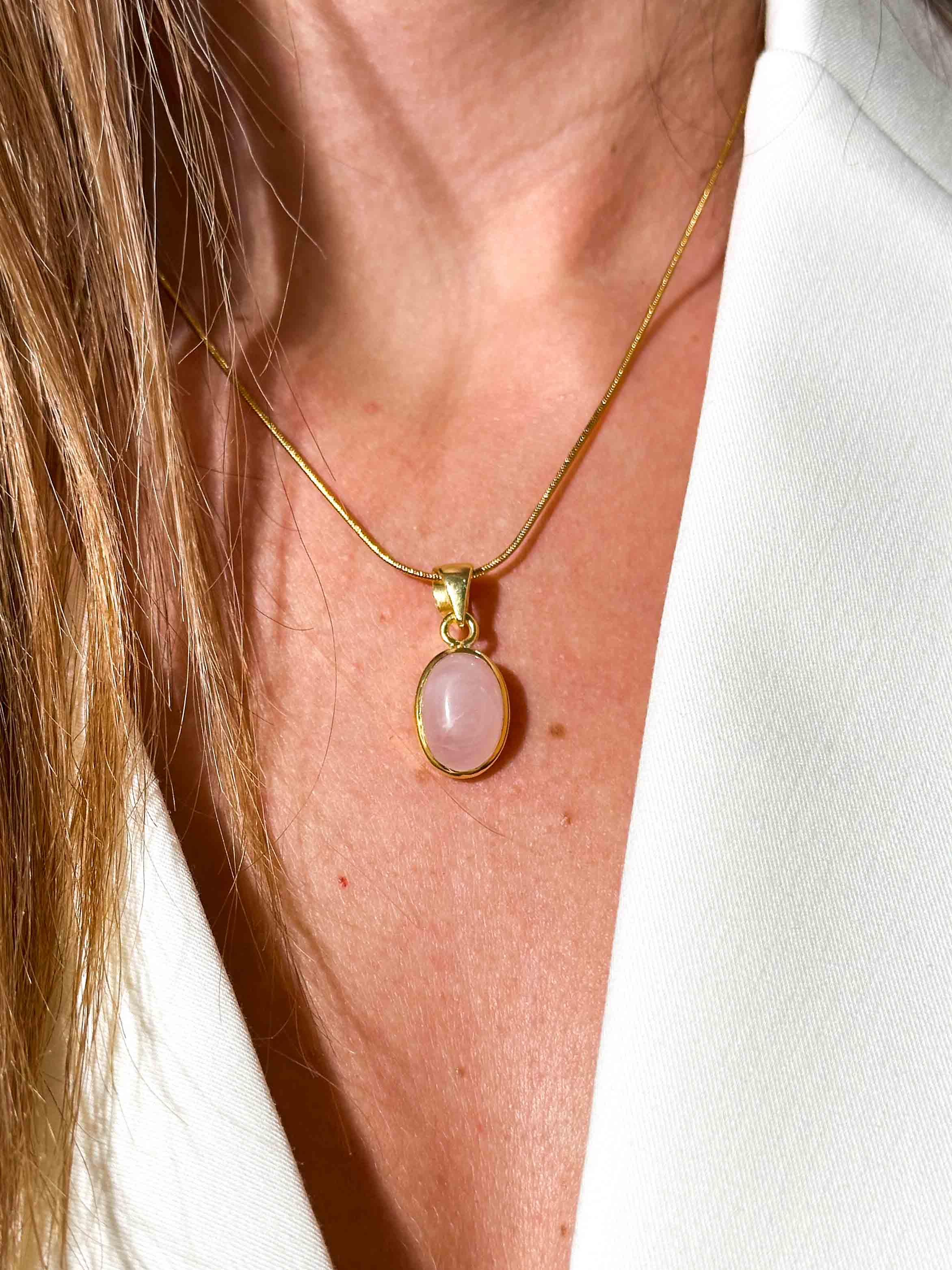 Ένα ρομαντικό και κομψό κόσμημα που συνδυάζει τη λάμψη του χρυσού με την απαλή ενέργεια του Ροζ Χαλαζία. Ο ροζ χαλαζίας είναι πέτρα αγάπης, ηρεμίας και συναισθηματικής ισορροπίας· ενισχύει την αυτοαγάπη, τη γαλήνη και τη θετική ενέργεια, ενώ φέρνει ζεστασιά στις σχέσεις και ενδυναμώνει τη σύνδεση με τα συναισθήματα. Ιδανικό για όσους θέλουν να ακτινοβολούν τρυφερότητα και αρμονία.