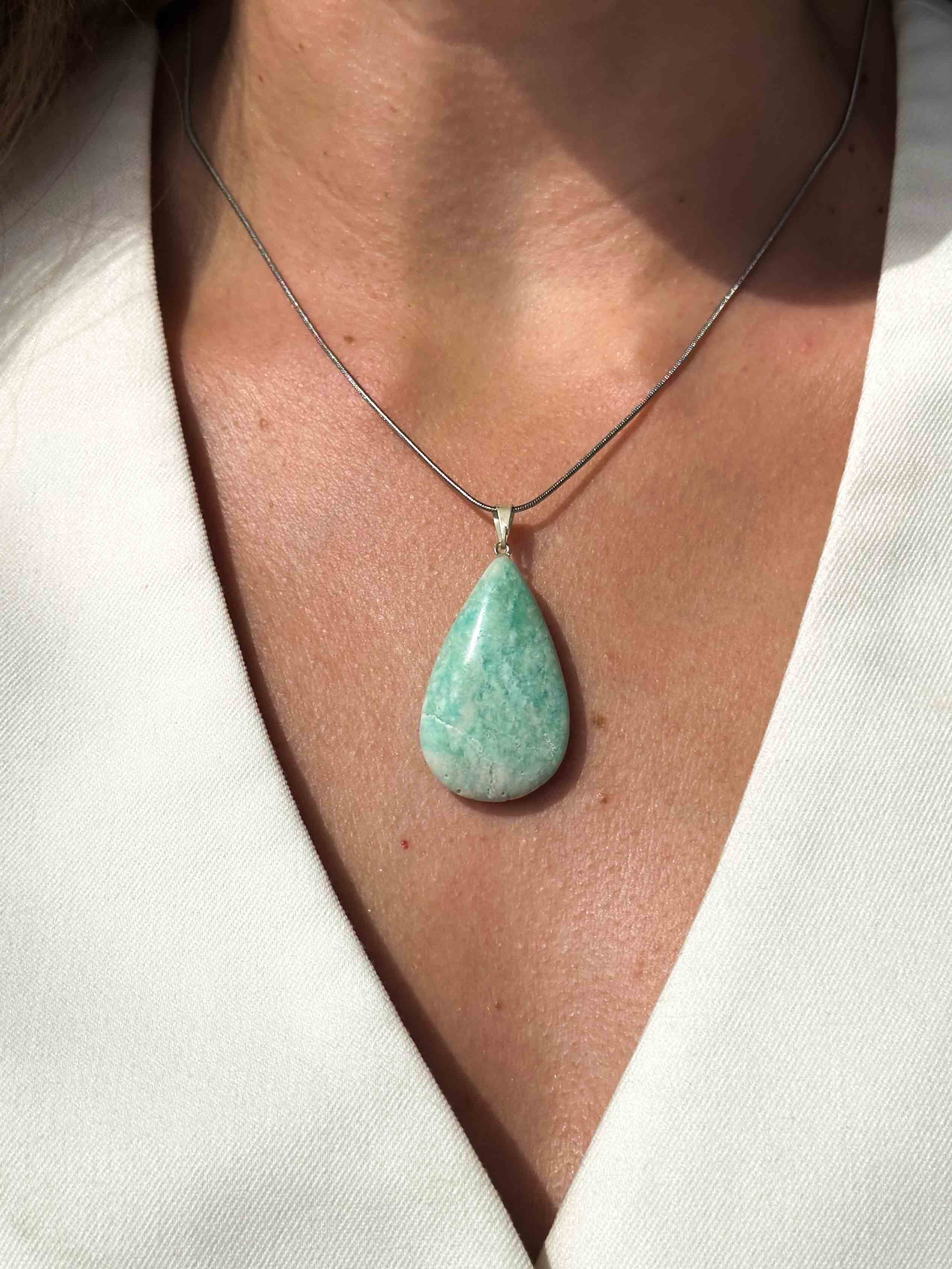 Ένα κομψό μενταγιόν από Αμαζονίτη σε σχήμα δάκρυ, που εκπέμπει ηρεμία και θετική ενέργεια. Ο Αμαζονίτης είναι η πέτρα της αρμονίας και της εσωτερικής ισορροπίας· φέρνει γαλήνη στο νου και βοηθά στην απελευθέρωση από το άγχος και την ένταση της καθημερινότητας.