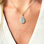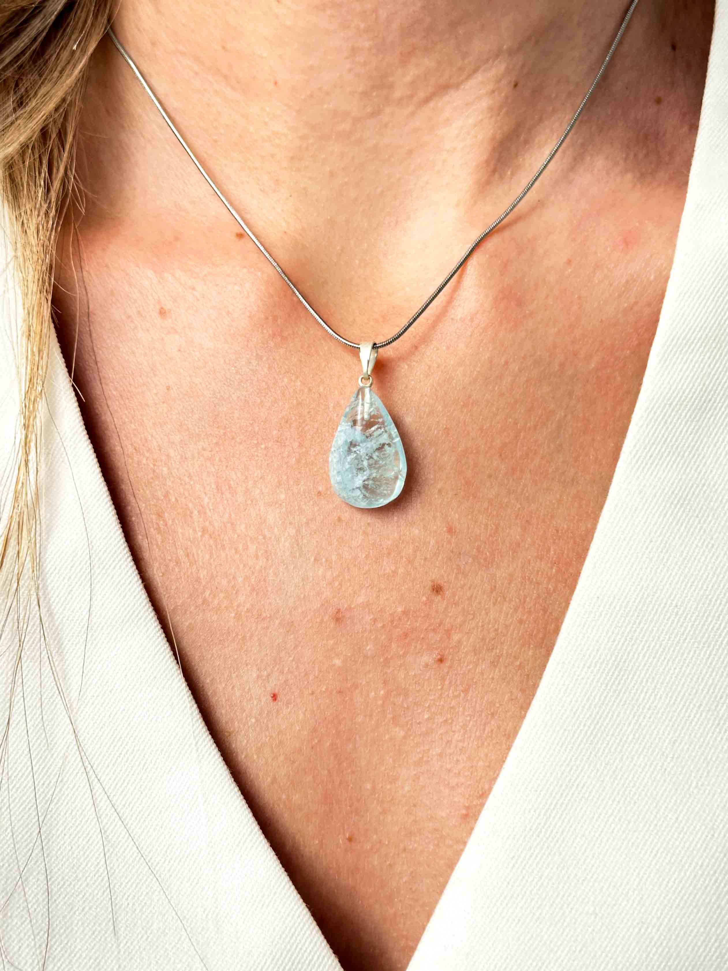 Ένα εκλεπτυσμένο μενταγιόν από Ακουαμαρίνα σε σχήμα δάκρυ, που αποπνέει καθαρότητα και γαλήνη. Η Ακουαμαρίνα είναι η πέτρα της θάλασσας και της εσωτερικής ηρεμίας· φέρνει αίσθηση ελευθερίας, ρέουσας ενέργειας και βοηθά στην απομάκρυνση φόβων και άγχους.