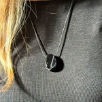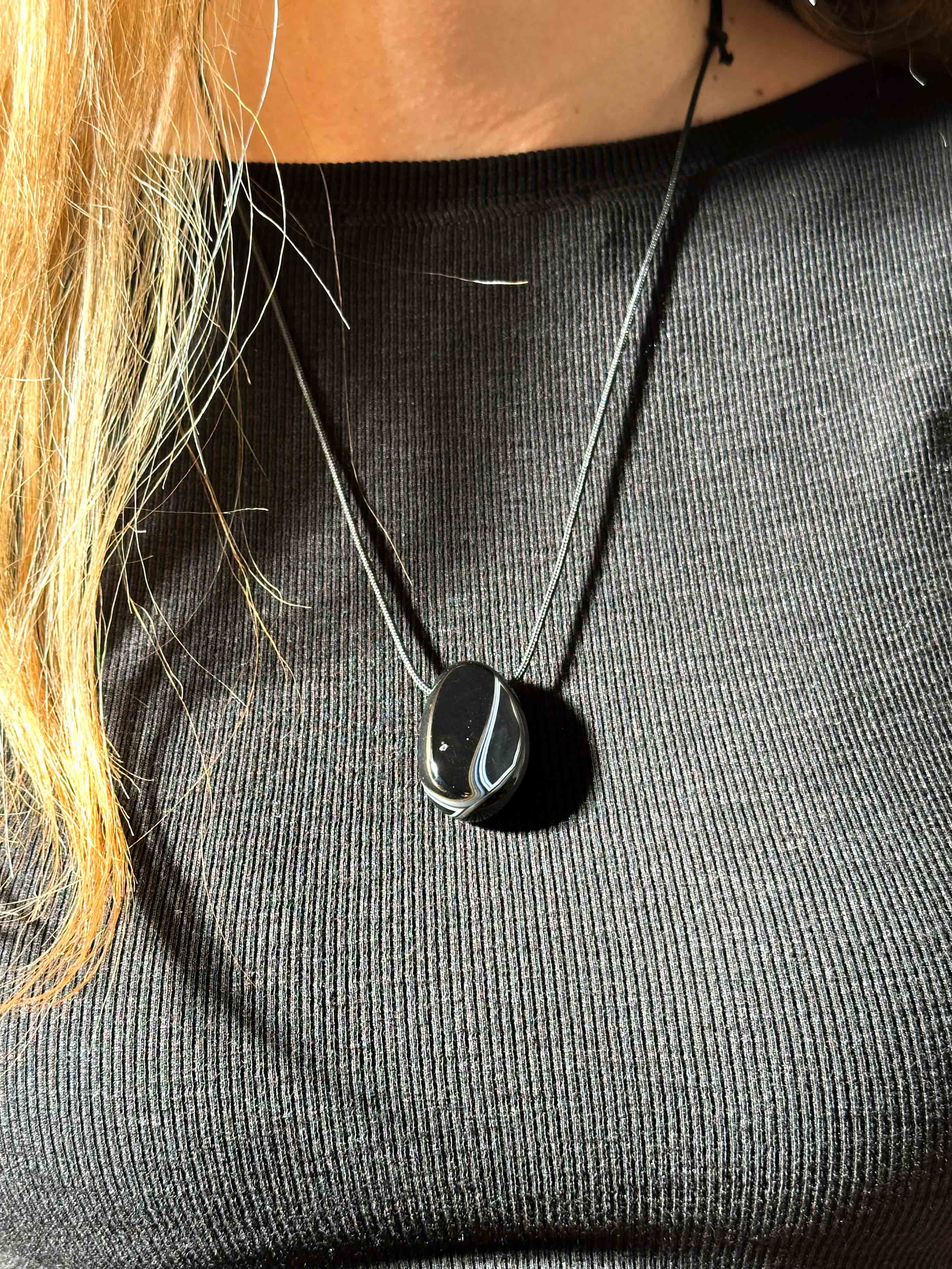Ένα κομψό και προστατευτικό μενταγιόν από φυσικό Μαύρο Αχάτη σε οβάλ σχήμα, δεμένο σε ρυθμιζόμενο μαύρο σχοινάκι για άνετη εφαρμογή και minimal αισθητική. Η βαθιά, γυαλιστερή μαύρη επιφάνειά του αποπνέει μυστήριο, ισορροπία και εσωτερική δύναμη — ένα κόσμημα που ταιριάζει με όλα και ξεχωρίζει διακριτικά.