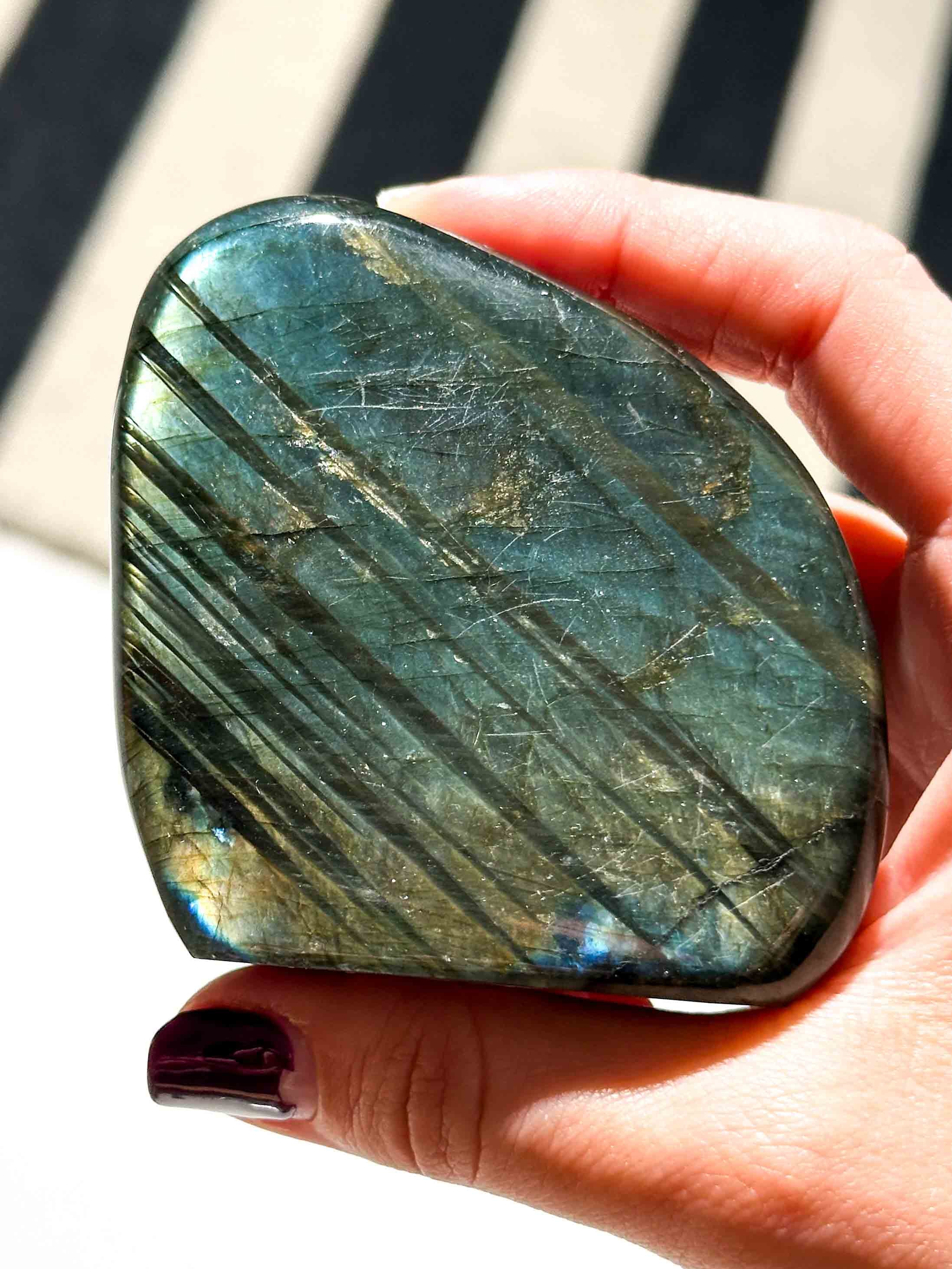 Αφήστε τον Λαβραδορίτη να φωτίσει κάθε γωνιά σας, να ξυπνήσει την έμπνευση και να γεμίσει τον χώρο σας με την υπερβατική του ενέργεια. Κάθε γωνία του κρυστάλλου αποκαλύπτει μια νέα ιστορία, μια νέα δόνηση, μια νέα μαγεία.