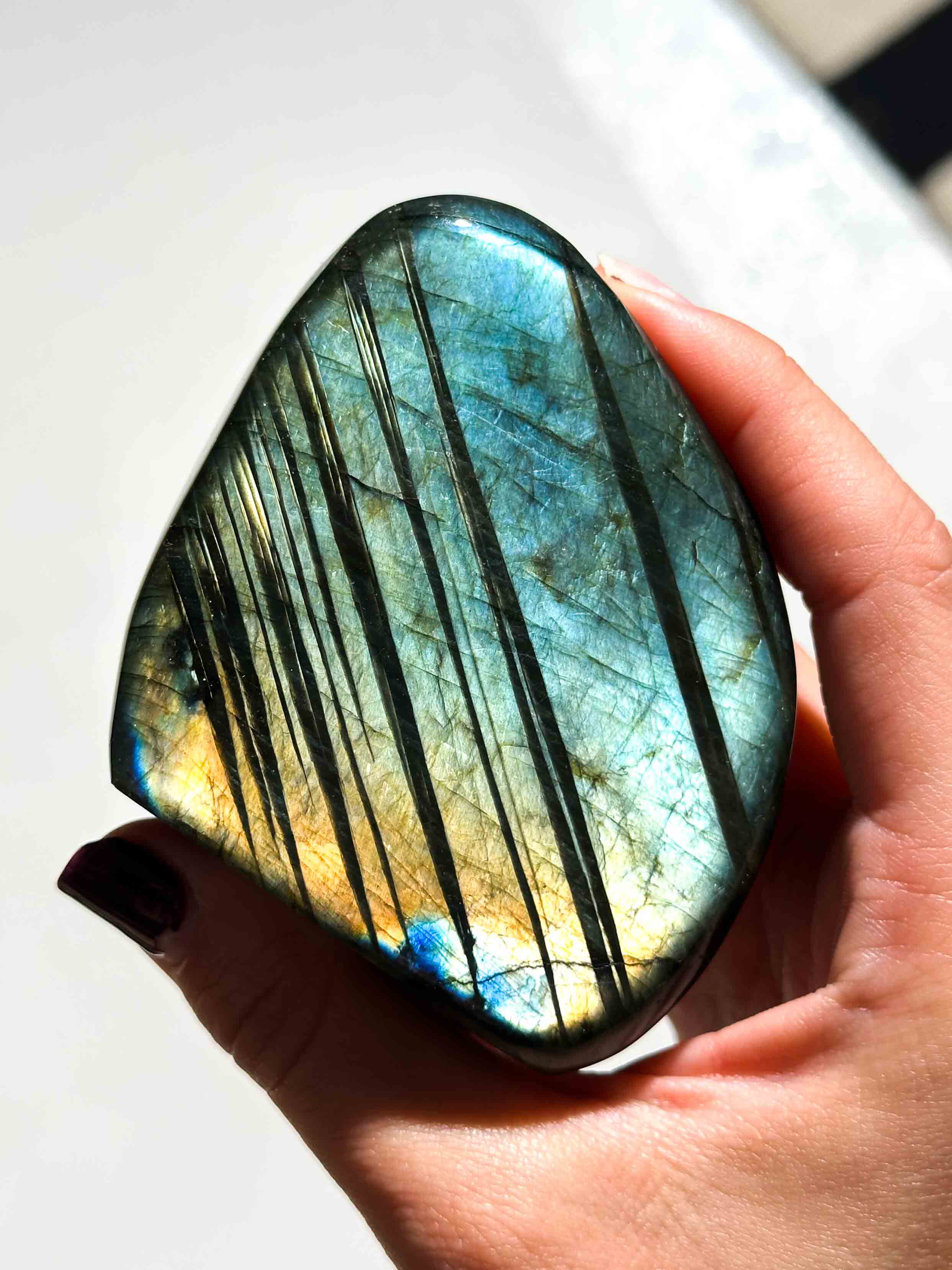 Αφεθείτε στη μαγεία ενός κρυστάλλου που κρατά μέσα του τον ουρανό και το φως του ήλιου. Ο Λαβραδορίτης με γαλάζιους και χρυσούς ιριδισμούς αιχμαλωτίζει κάθε ακτίνα φωτός, αποκαλύπτοντας συνεχώς νέες αποχρώσεις και μυστικά μοτίβα. Κάθε κομμάτι είναι μοναδικό, σαν μικρό παράθυρο σε έναν άλλο κόσμο, γεμίζοντας τον χώρο με μαγεία, θαυμασμό και θετική ενέργεια.