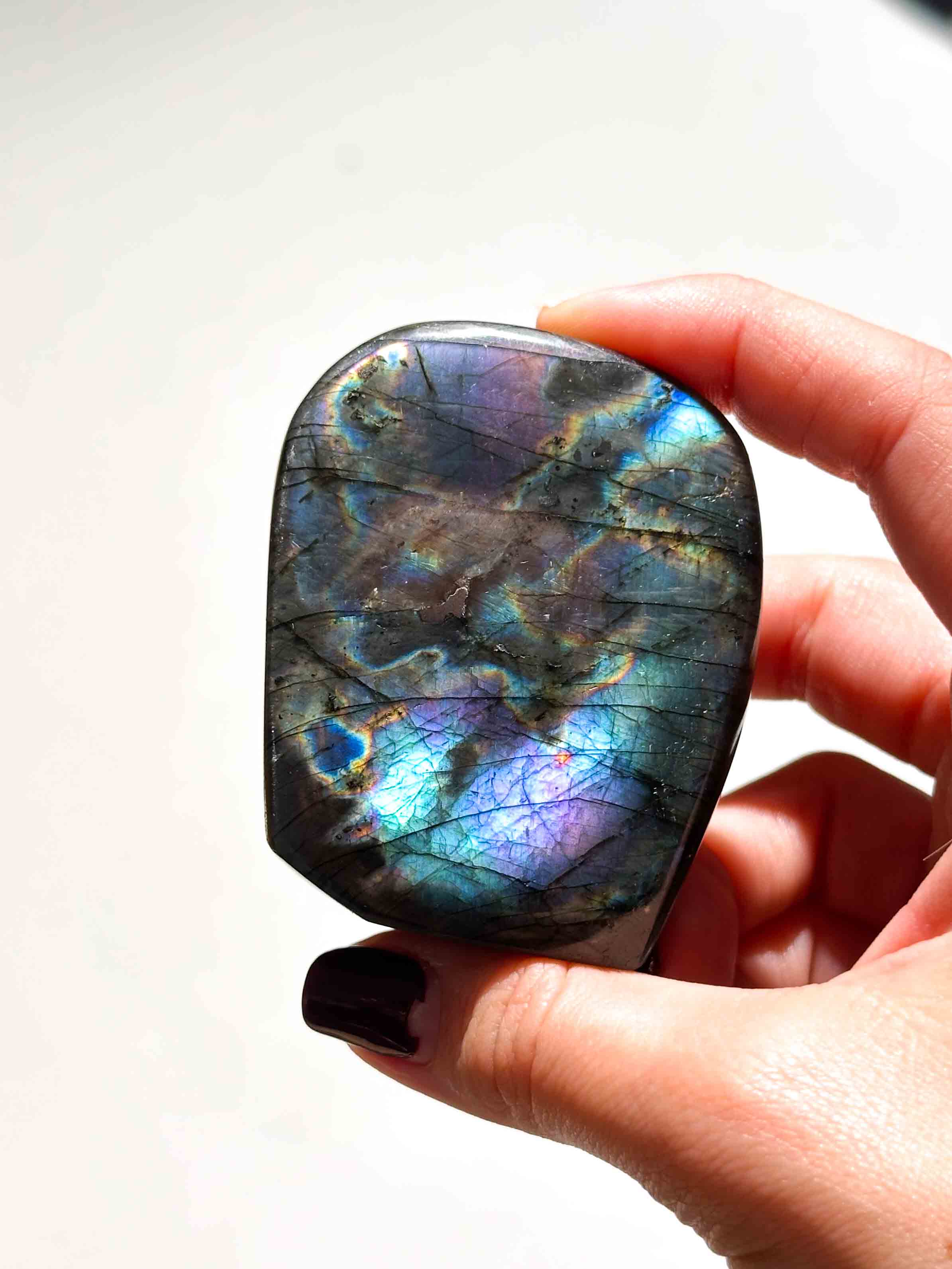 Ο λειασμένος Λαβραδορίτης με μωβ ιριδισμούς είναι ιδανικός για συλλέκτες, διαλογισμό ή ως εντυπωσιακό κομμάτι ενέργειας στον χώρο σας, που αιχμαλωτίζει το φως και εκπέμπει θετική δόνηση.