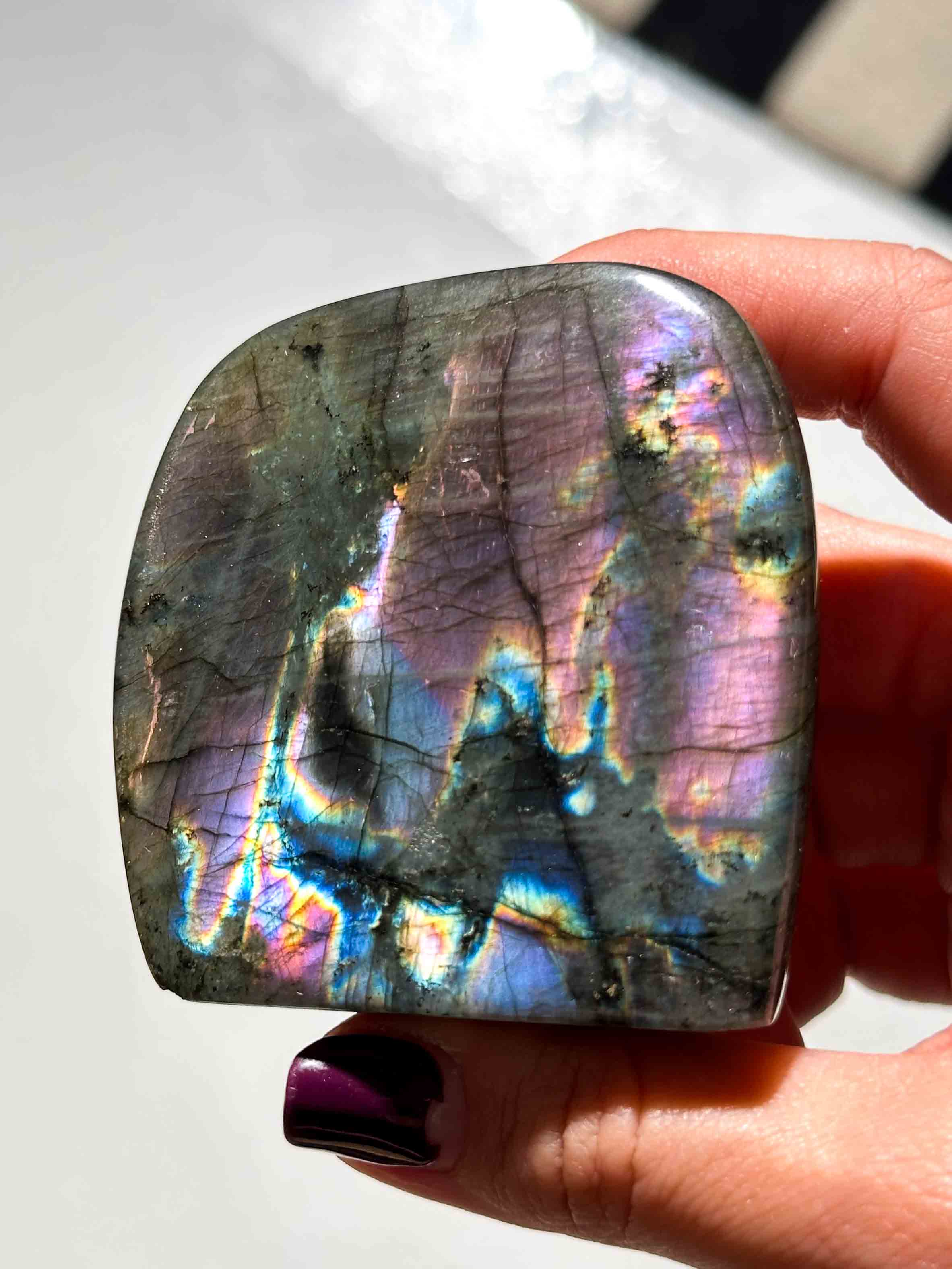Ο λειασμένος Λαβραδορίτης με μωβ ιριδισμούς είναι ιδανικός για συλλέκτες, διαλογισμό ή ως εντυπωσιακό κομμάτι ενέργειας στον χώρο σας, που αιχμαλωτίζει το φως και εκπέμπει θετική δόνηση.