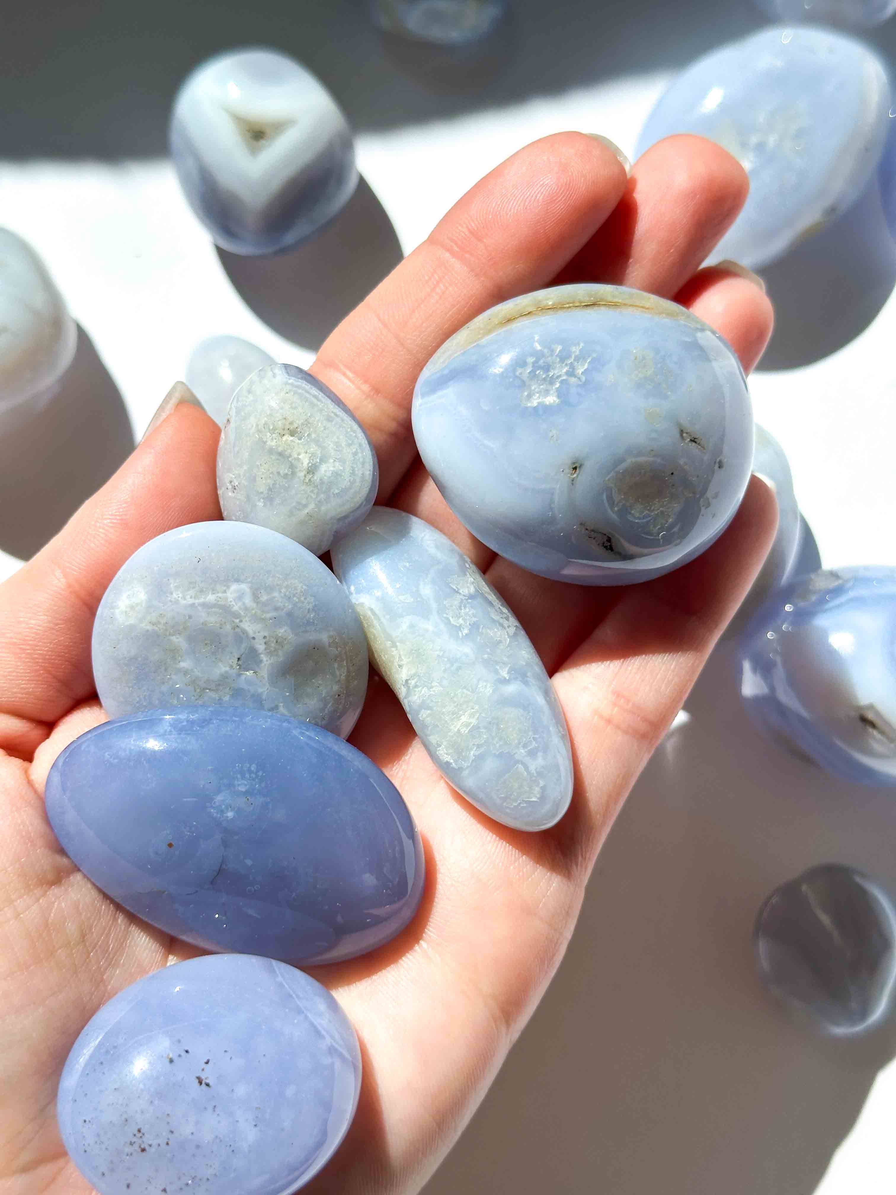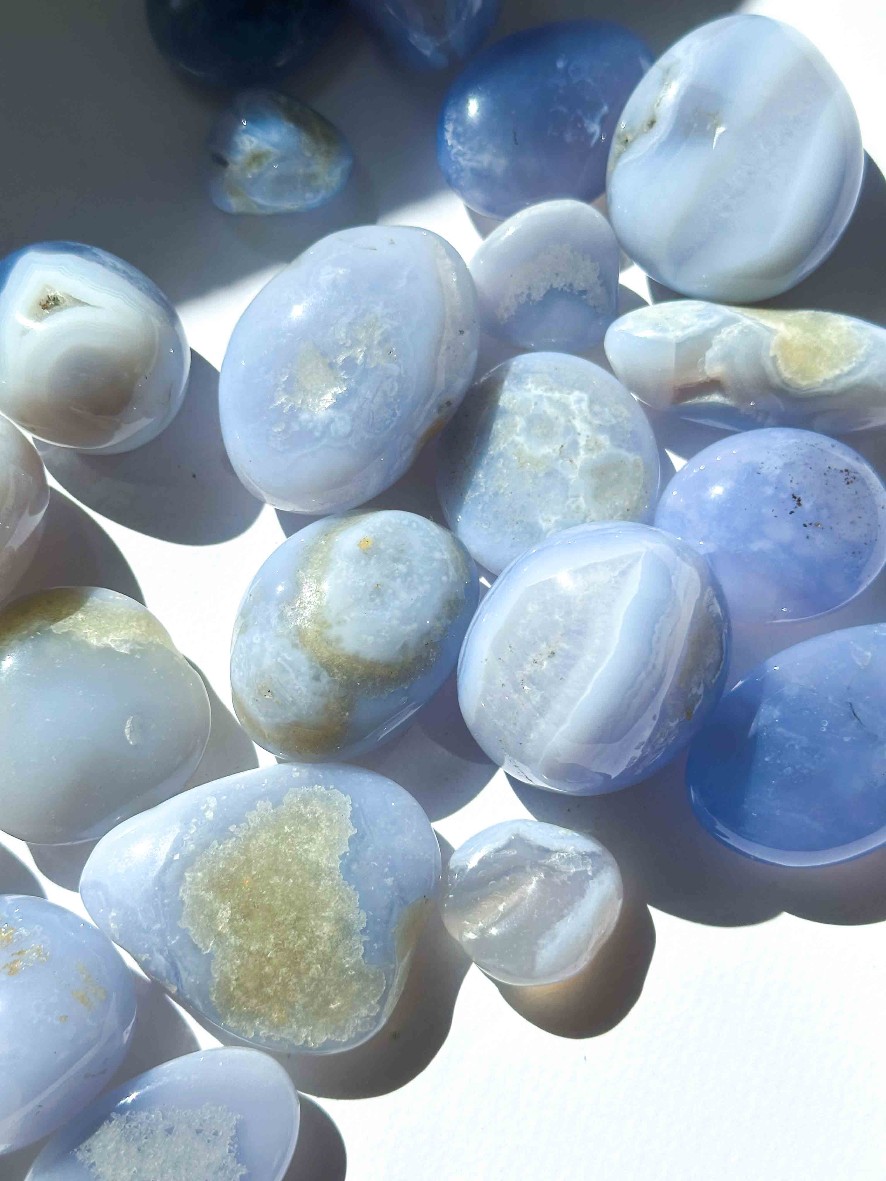 Οι μπλε κρύσταλλοι Αχάτη μπορούν επίσης να χρησιμοποιηθούν για την προώθηση της βαθιάς χαλάρωσης και γαλήνης, καθιστώντας τους μια εξαιρετική επιλογή για χρήση στον διαλογισμό ή στην ενεργειακή θεραπεία.