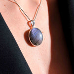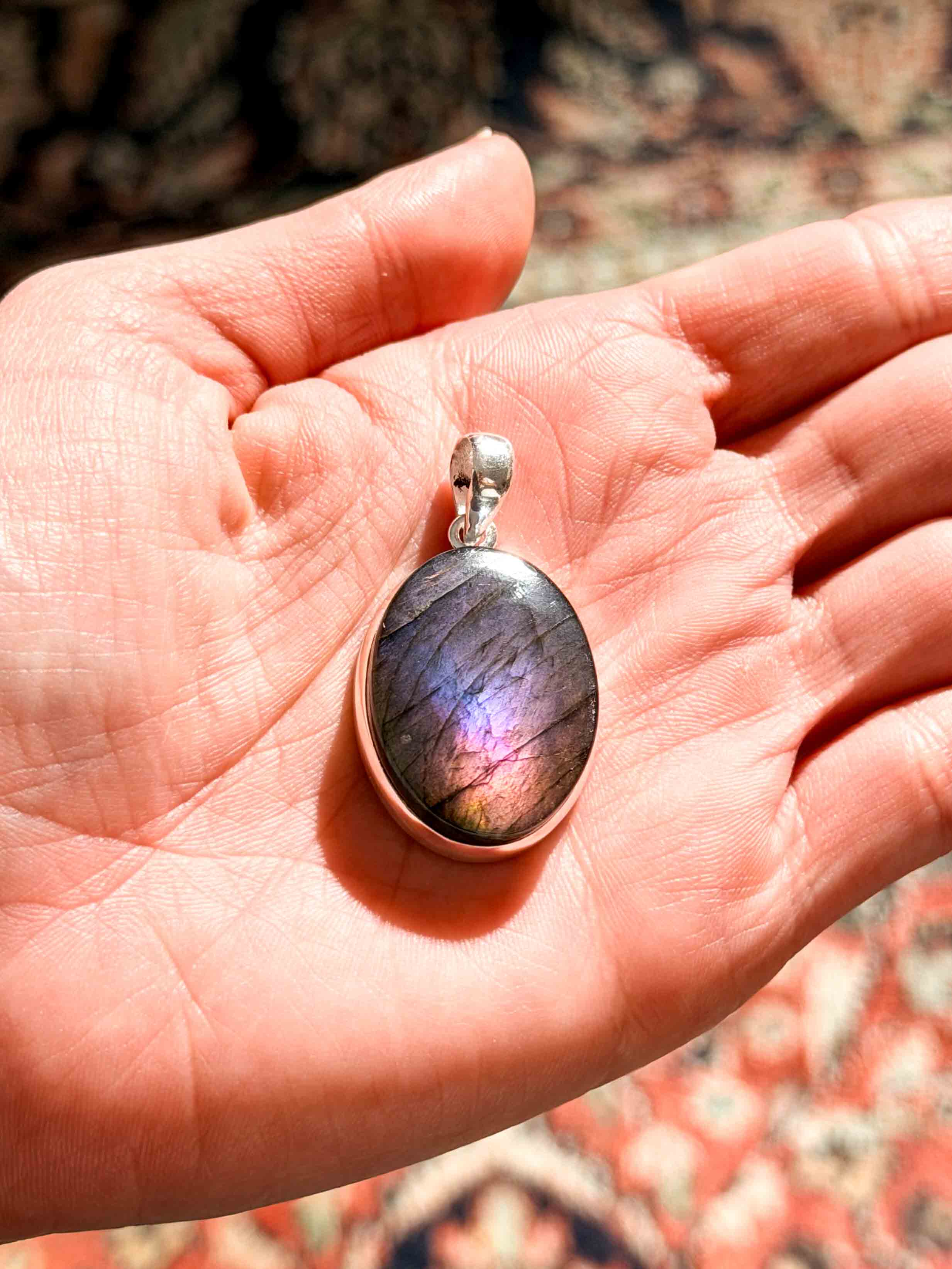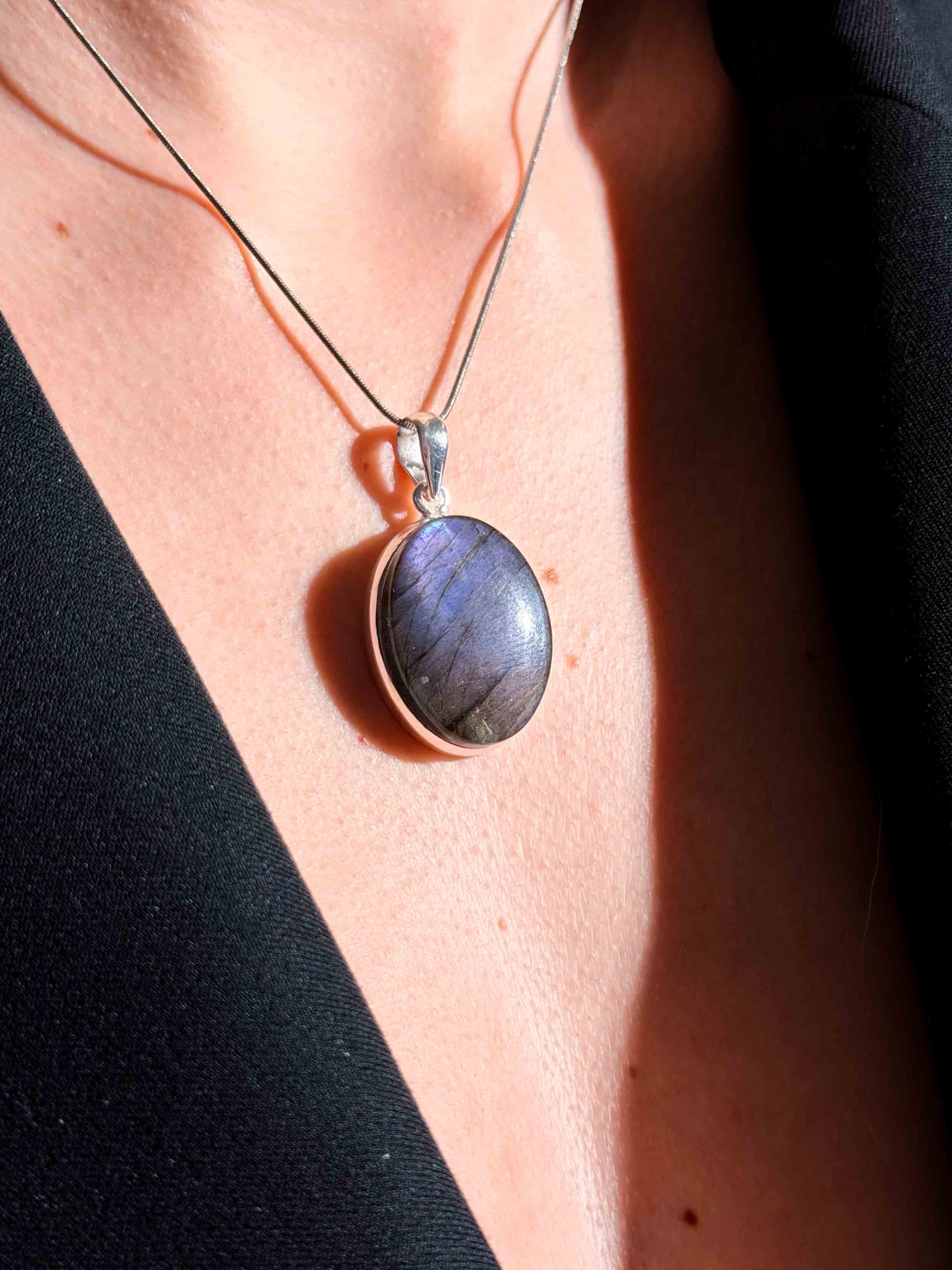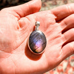 Εντυπωσιάστε με ένα κόσμημα που μαγνητίζει το βλέμμα. Αυτό το χειροποίητο μενταγιόν φιλοξενεί έναν σπάνιο, φυσικό Μωβ Λαβραδορίτη σε οβάλ κοπή. Η επιφάνειά του κρύβει ένα εντυπωσιακό παιχνίδι χρωμάτων, όπου το βαθύ μωβ συναντά βιολετί και ροζ ανταύγειες καθώς το φως πέφτει πάνω του. Το στιβαρό και λιτό δέσιμο από ασήμι 925 αναδεικνύει το μέγεθος και τη μοναδικότητα του λίθου, καθιστώντας το ένα κομμάτι με πραγματική παρουσία.