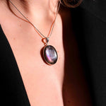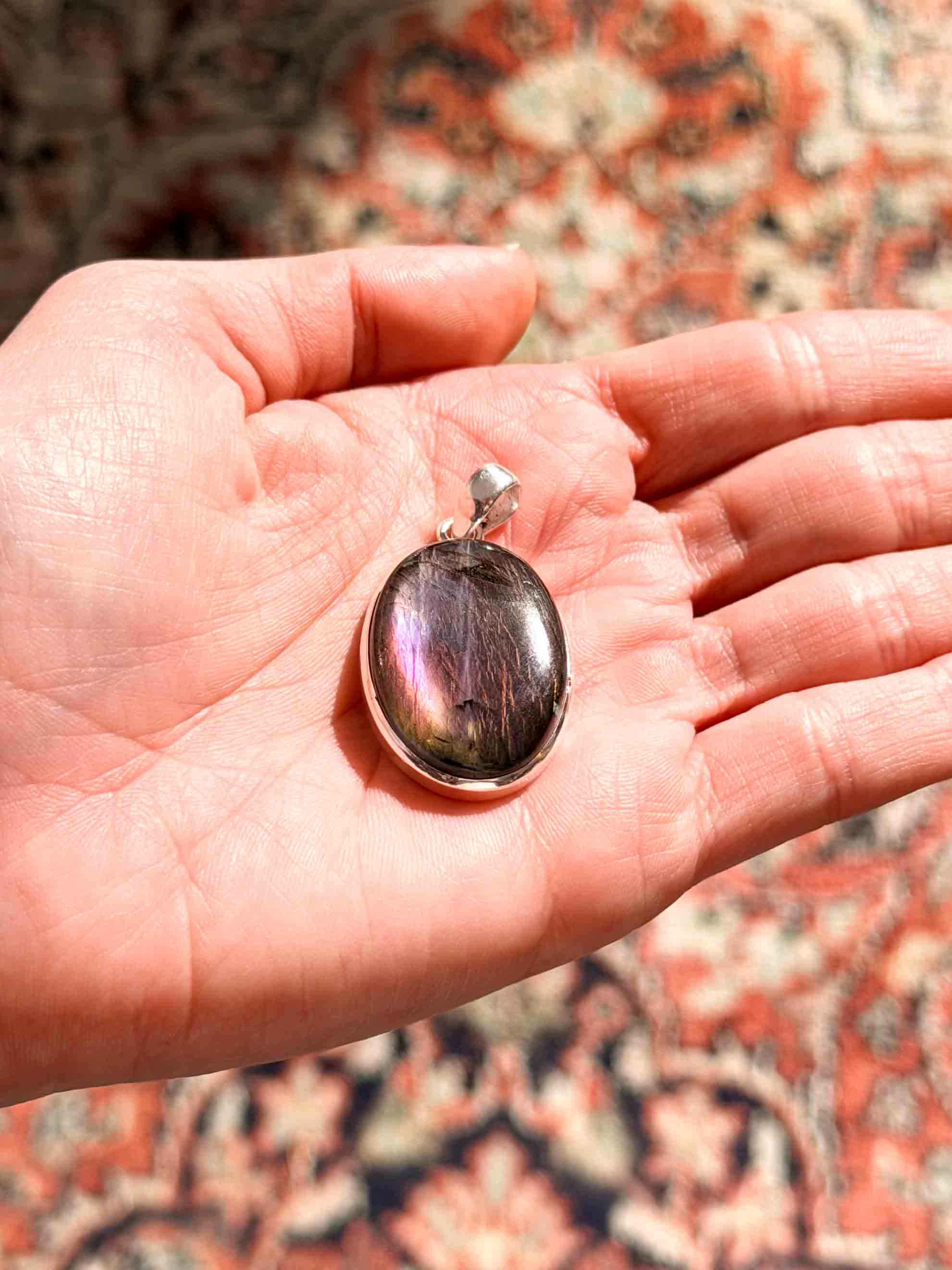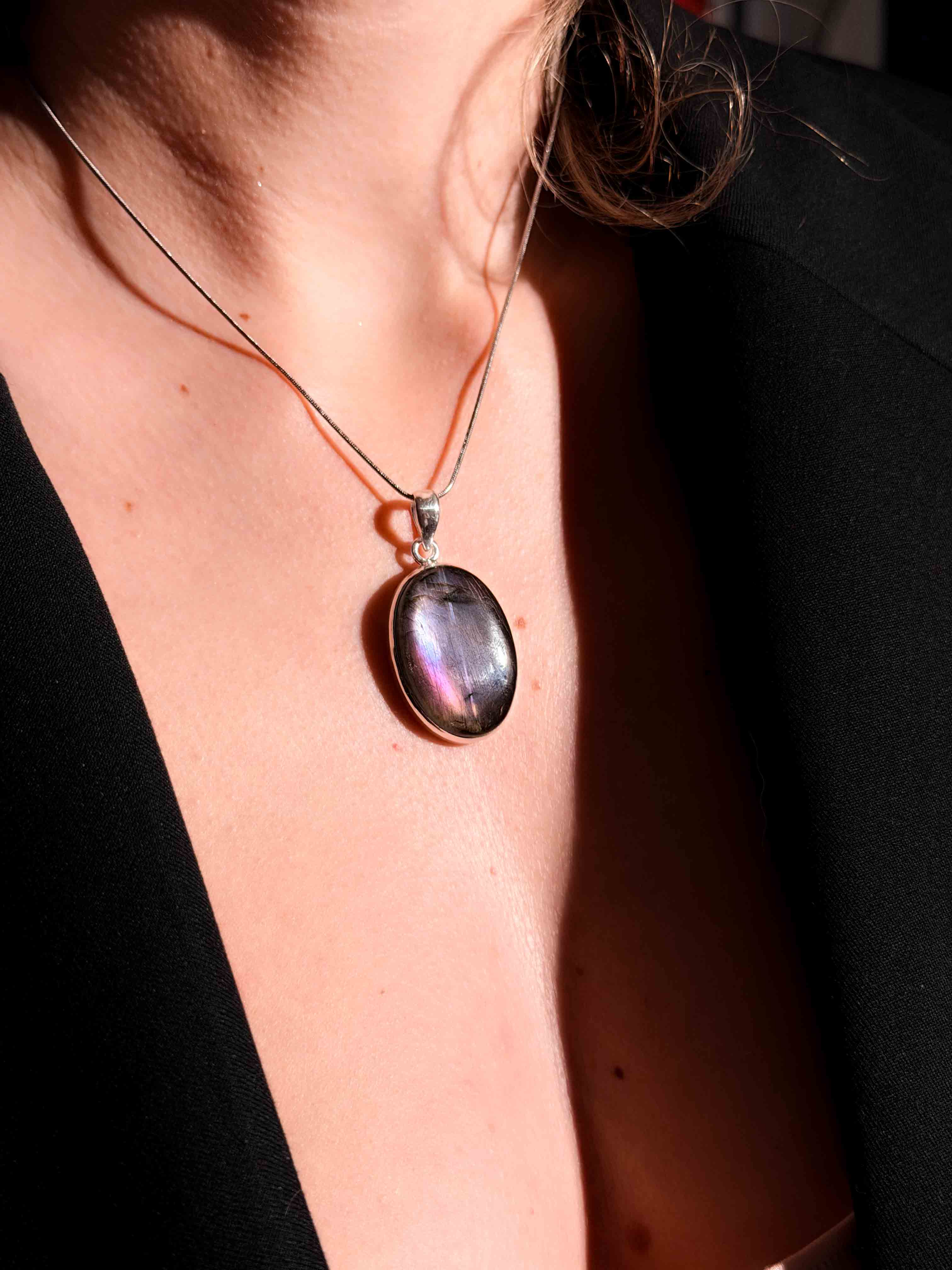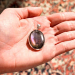 Εντυπωσιάστε με ένα κόσμημα που μαγνητίζει το βλέμμα. Αυτό το χειροποίητο μενταγιόν φιλοξενεί έναν σπάνιο, φυσικό Μωβ Λαβραδορίτη σε οβάλ κοπή. Η επιφάνειά του κρύβει ένα εντυπωσιακό παιχνίδι χρωμάτων, όπου το βαθύ μωβ συναντά βιολετί και ροζ ανταύγειες καθώς το φως πέφτει πάνω του. Το στιβαρό και λιτό δέσιμο από ασήμι 925 αναδεικνύει το μέγεθος και τη μοναδικότητα του λίθου, καθιστώντας το ένα κομμάτι με πραγματική παρουσία.