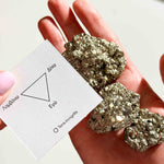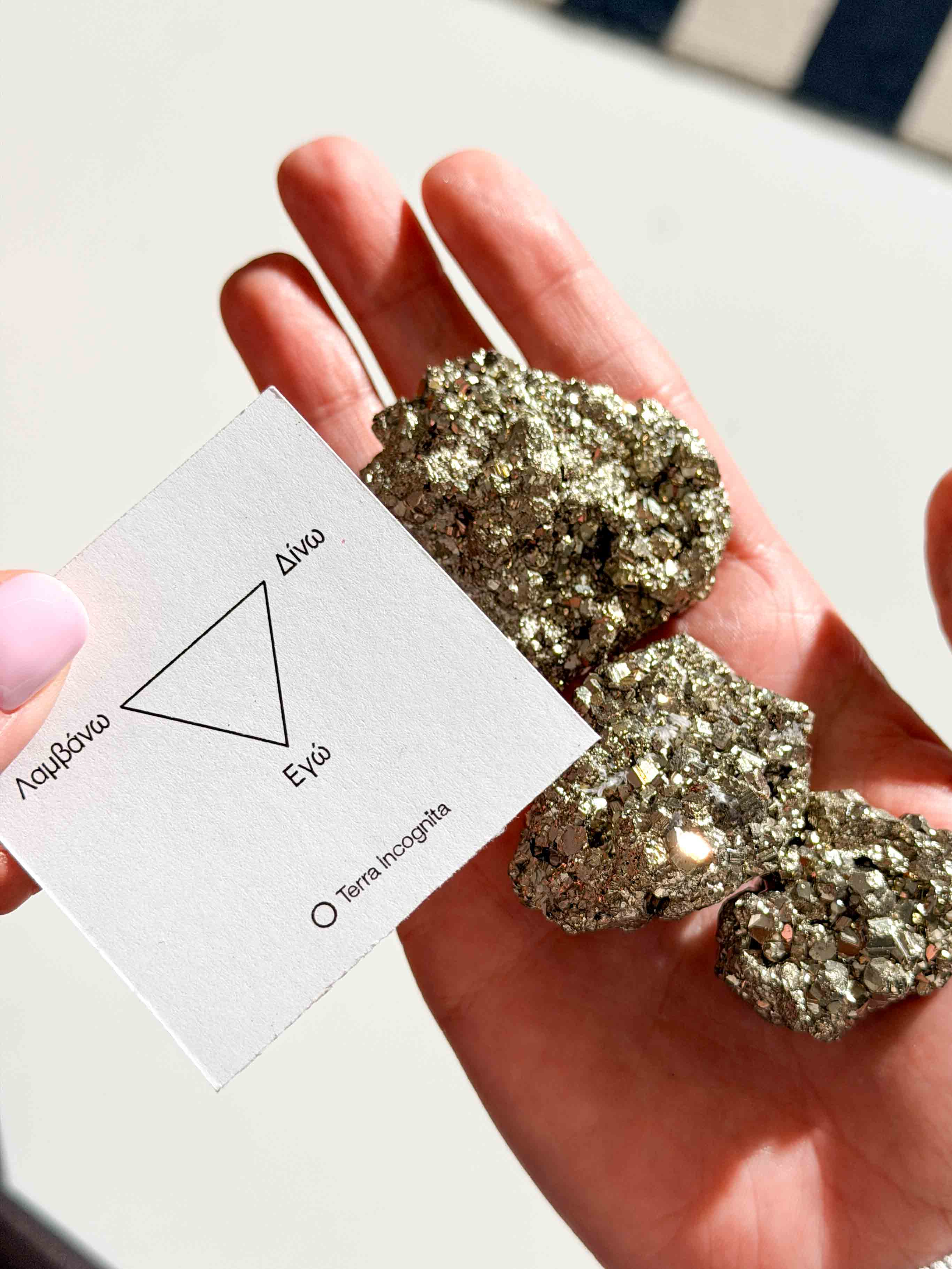 Μέσα από το ιερό τρίγωνο της ισορροπίας —Δίνω, Λαμβάνω, Εγώ— το kit της Terra Incognita σας προσκαλεί να ευθυγραμμιστείτε με τη συμπαντική ροή. Τοποθετήστε τους πυρίτες στο χώρο εργασίας σας ή στο σημείο που οραματίζεστε τους στόχους σας και αφήστε τη λαμπερή, γήινη ενέργειά τους να θωρακίσει την αυτοπεποίθησή σας.