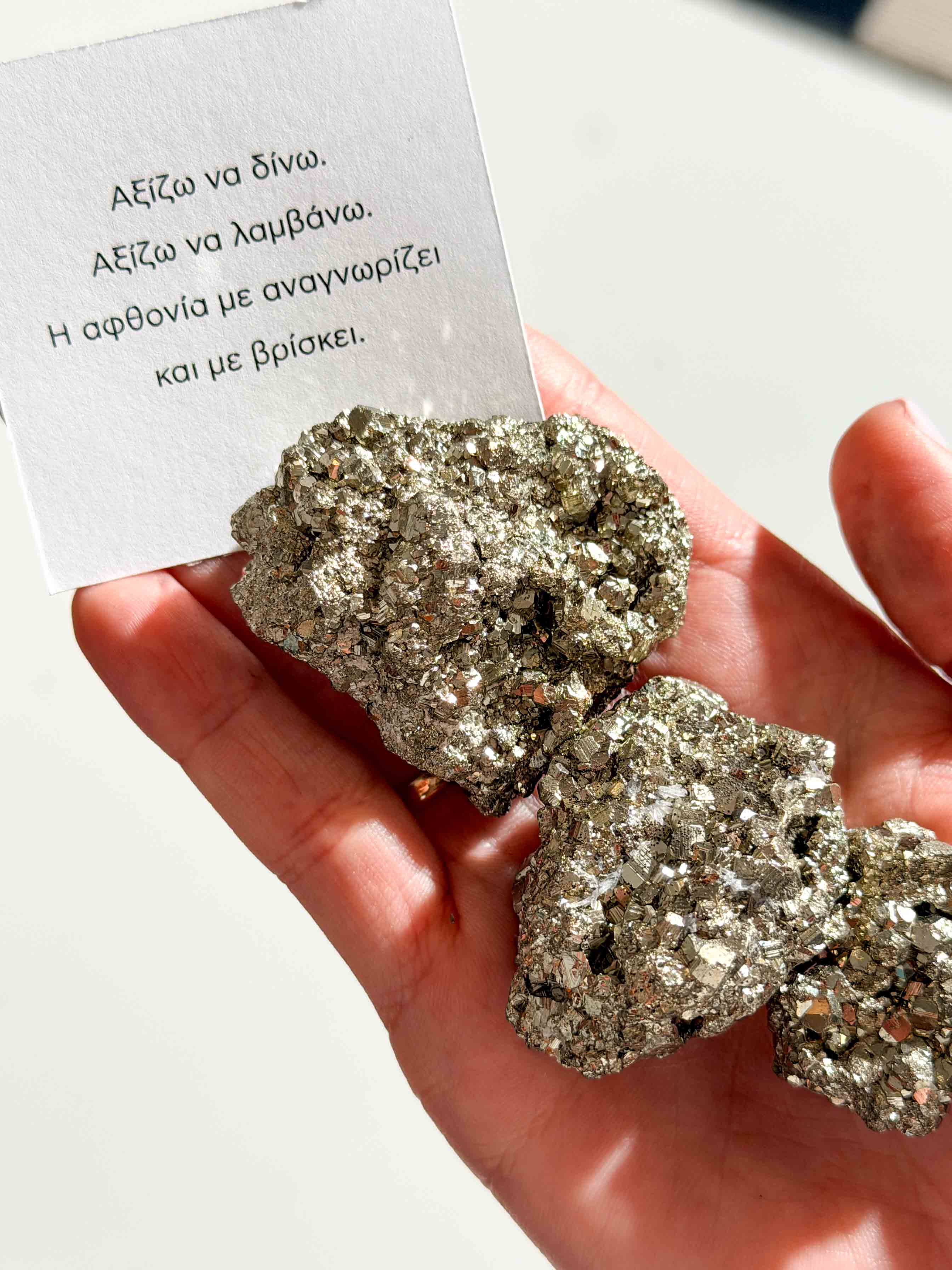 Η ισορροπία ανάμεσα στο να προσφέρεις (Δίνω) και στο να επιτρέπεις στον εαυτό σου να αποδεχτεί (Λαμβάνω) είναι το κλειδί για μια ζωή σε πλήρη αρμονία. Το Pyrite Energy Set είναι ο καθημερινός σας σύμμαχος και σας υπενθυμίζει ότι η αφθονία δεν είναι κάτι που κυνηγάτε, αλλά κάτι που προσελκύετε όταν αναγνωρίζετε την αξία σας.