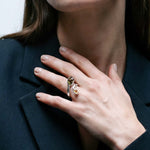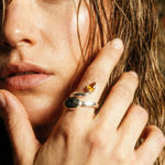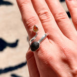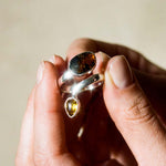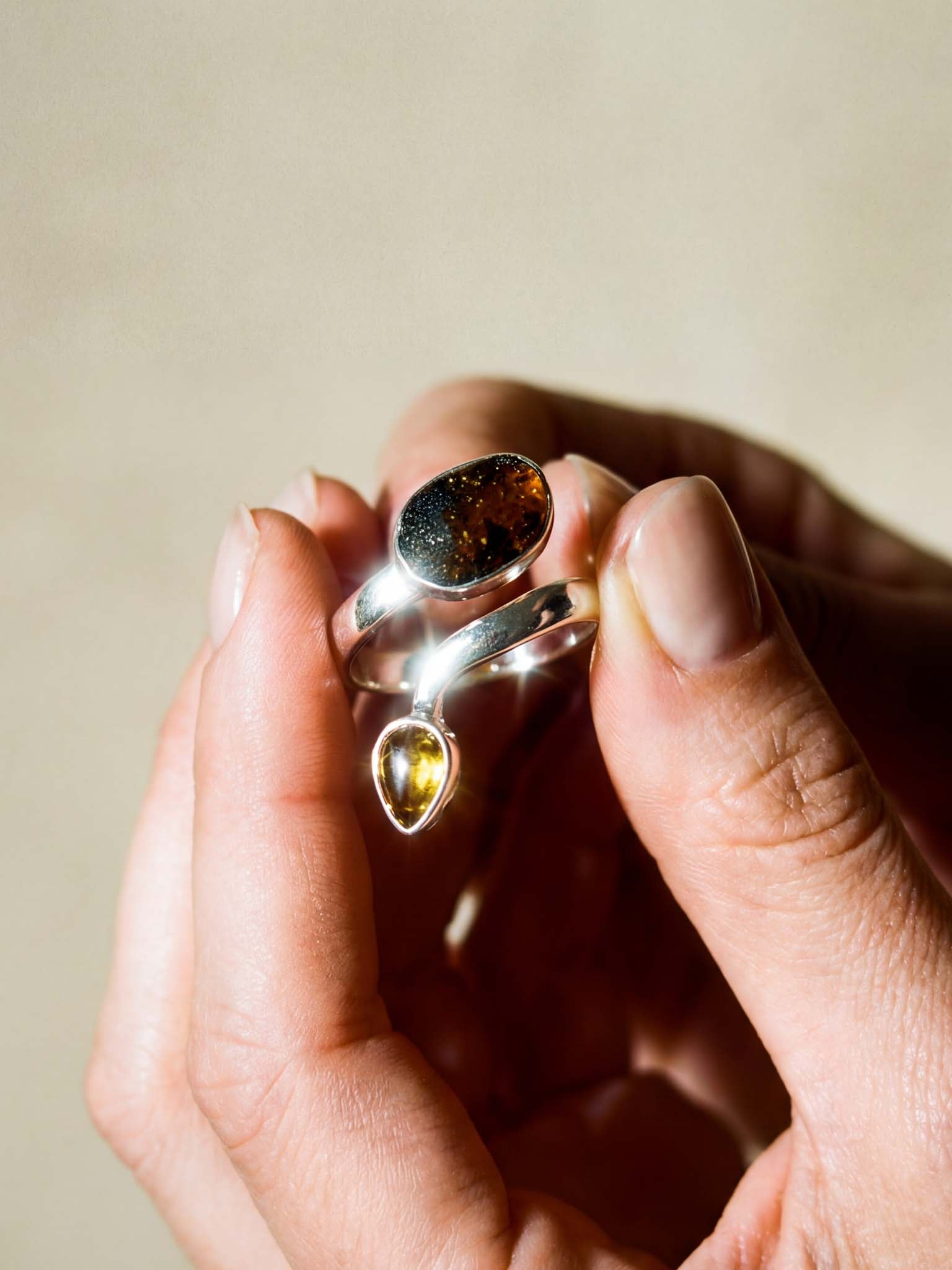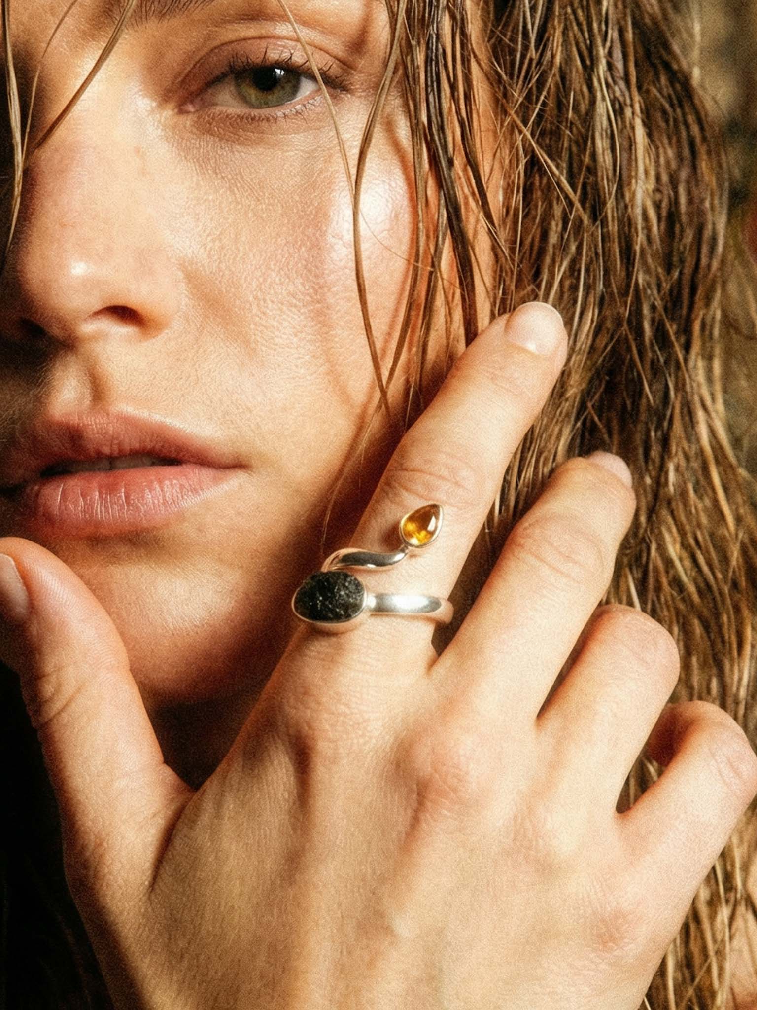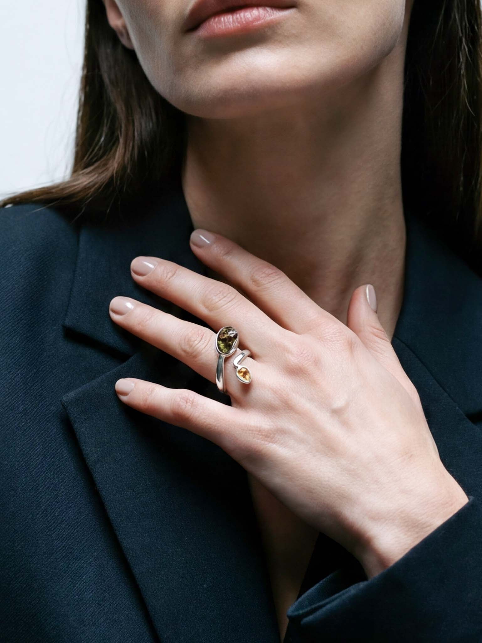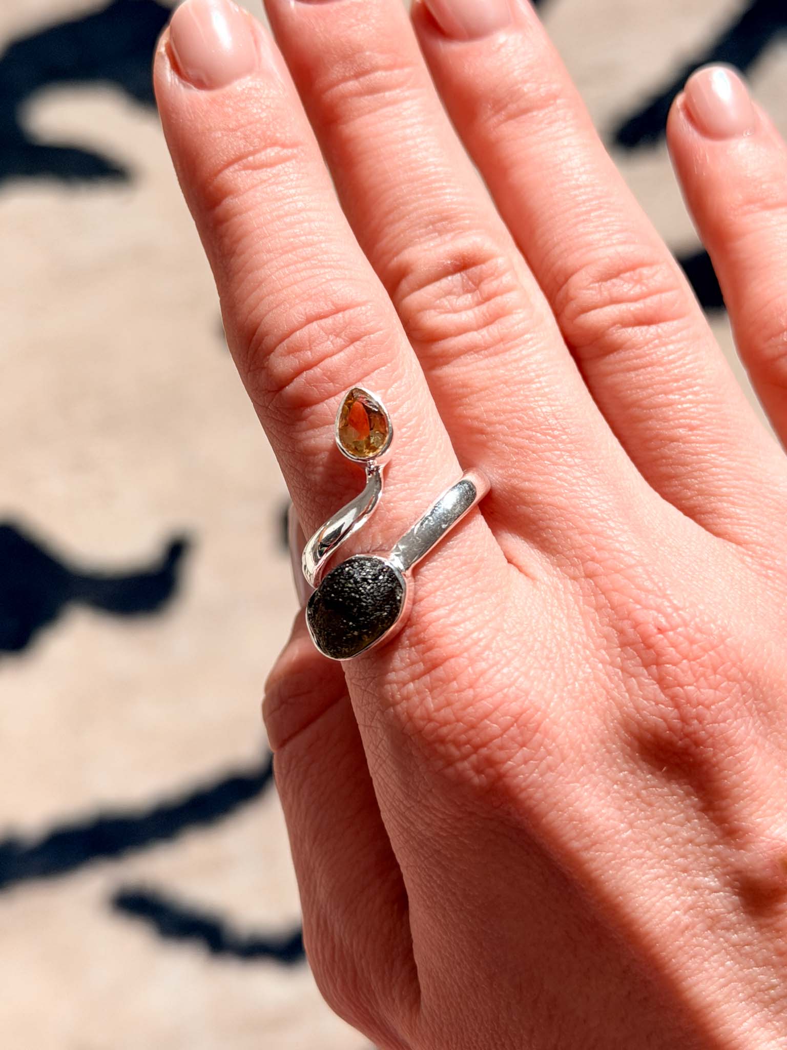 Φορέστε τη δύναμη της δημιουργίας στα χέρια σας με αυτό το κομψό, χειροποίητο δαχτυλίδι από Ασήμι 925. Ένας εκθαμβωτικός συνδυασμός που παντρεύει την ακατέργαστη, εξωγήινη γοητεία του Μολδαβίτη με την αστραφτερή κομψότητα του Κιτρίνη.