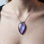 Κλέψτε τις εντυπώσεις και αναδείξτε το προσωπικό σας στυλ με αυτό το επιβλητικό και άκρως σαγηνευτικό μενταγιόν. Στο επίκεντρο του κοσμήματος βρίσκεται ένας εντυπωσιακός σε μέγεθος, φυσικός Μωβ Λαβραδορίτης σε κλασική οβάλ κοπή, περίτεχνα και λιτά δεμένος σε Ασήμι 925, ώστε να αφήνει την πέτρα να πρωταγωνιστεί.