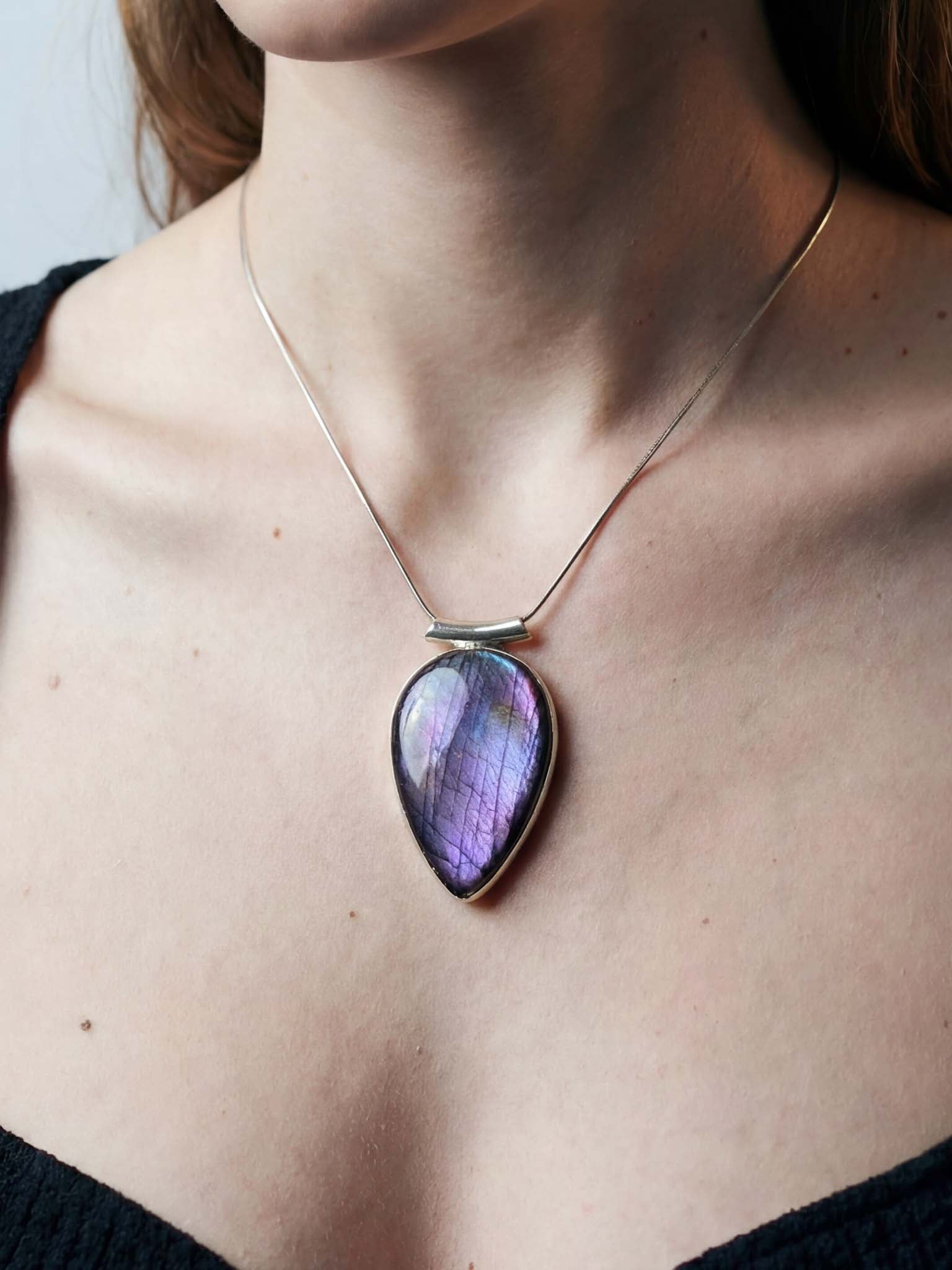 • Λίθος: Σπάνιος Φυσικός Μωβ Λαβραδορίτης (Purple Labradorite) σε μεγάλη οβάλ κοπή, με έντονους γραμμικούς ιριδισμούς.