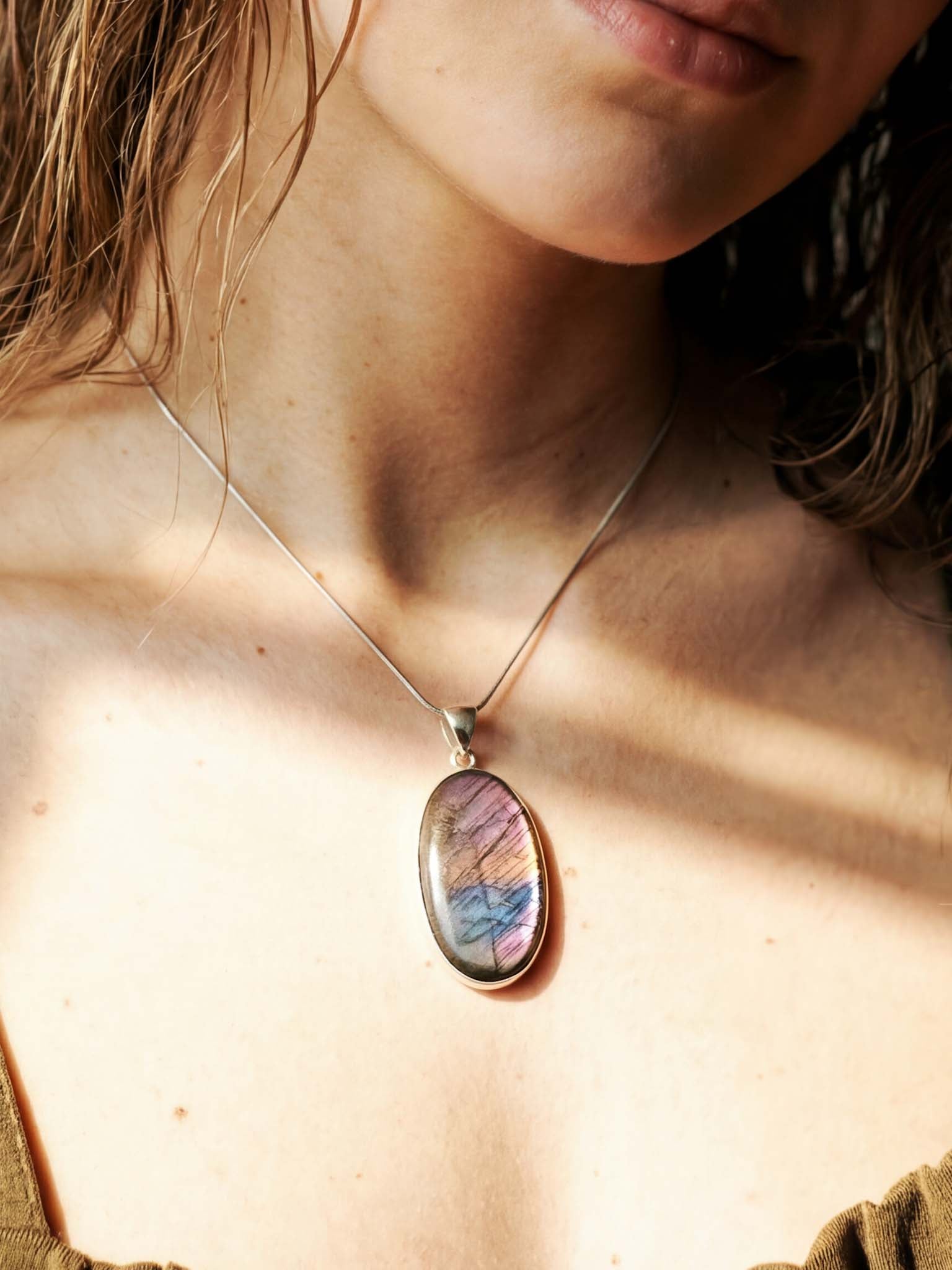 Αυτή η εξαιρετικά σπάνια ποικιλία λαβραδορίτη μαγνητίζει τα βλέμματα χάρη στους μοναδικούς ιριδισμούς της. Καθώς το φως αντανακλάται στην επιφάνειά του, ο λίθος αποκαλύπτει ένα μαγευτικό παιχνίδισμα χρωμάτων, ακροβατώντας ανάμεσα σε αποχρώσεις του βαθύ μωβ, του βιολετί και του ροζ. Το μενταγιόν συνοδεύεται από μια λεπτή αλλά ιδιαίτερα ανθεκτική ατσάλινη αλυσίδα, προσφέροντας ένα ολοκληρωμένο και εντυπωσιακό κόσμημα.