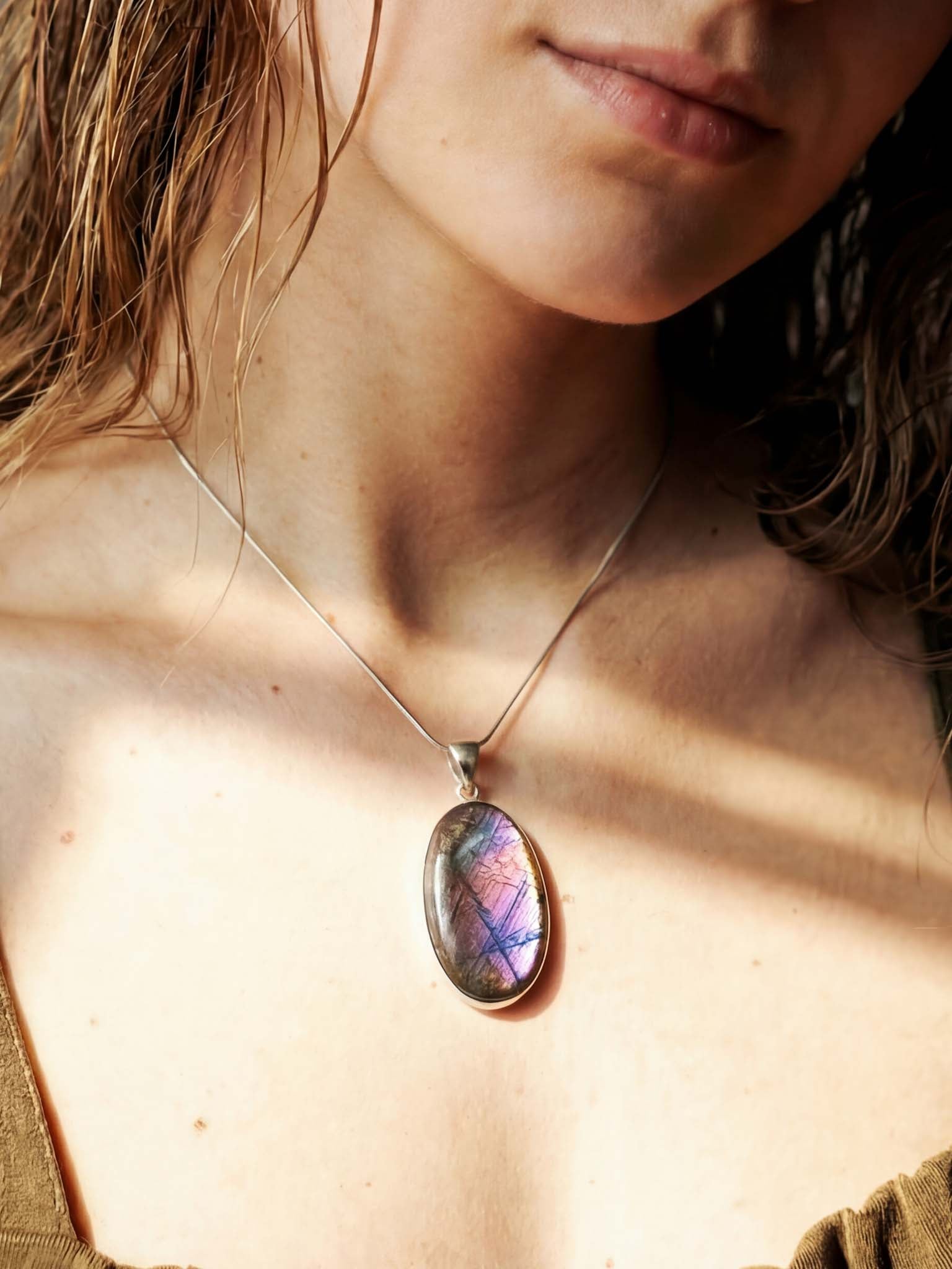 Αυτή η εξαιρετικά σπάνια ποικιλία λαβραδορίτη μαγνητίζει τα βλέμματα χάρη στους μοναδικούς ιριδισμούς της. Καθώς το φως αντανακλάται στην επιφάνειά του, ο λίθος αποκαλύπτει ένα μαγευτικό παιχνίδισμα χρωμάτων, ακροβατώντας ανάμεσα σε αποχρώσεις του βαθύ μωβ, του βιολετί και του ροζ. Το μενταγιόν συνοδεύεται από μια λεπτή αλλά ιδιαίτερα ανθεκτική ατσάλινη αλυσίδα, προσφέροντας ένα ολοκληρωμένο και εντυπωσιακό κόσμημα.