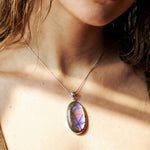 Κλέψτε τις εντυπώσεις και αναδείξτε το προσωπικό σας στυλ με αυτό το επιβλητικό και άκρως σαγηνευτικό μενταγιόν. Στο επίκεντρο του κοσμήματος βρίσκεται ένας εντυπωσιακός σε μέγεθος, φυσικός Μωβ Λαβραδορίτης σε κλασική οβάλ κοπή, περίτεχνα και λιτά δεμένος σε Ασήμι 925, ώστε να αφήνει την πέτρα να πρωταγωνιστεί.