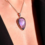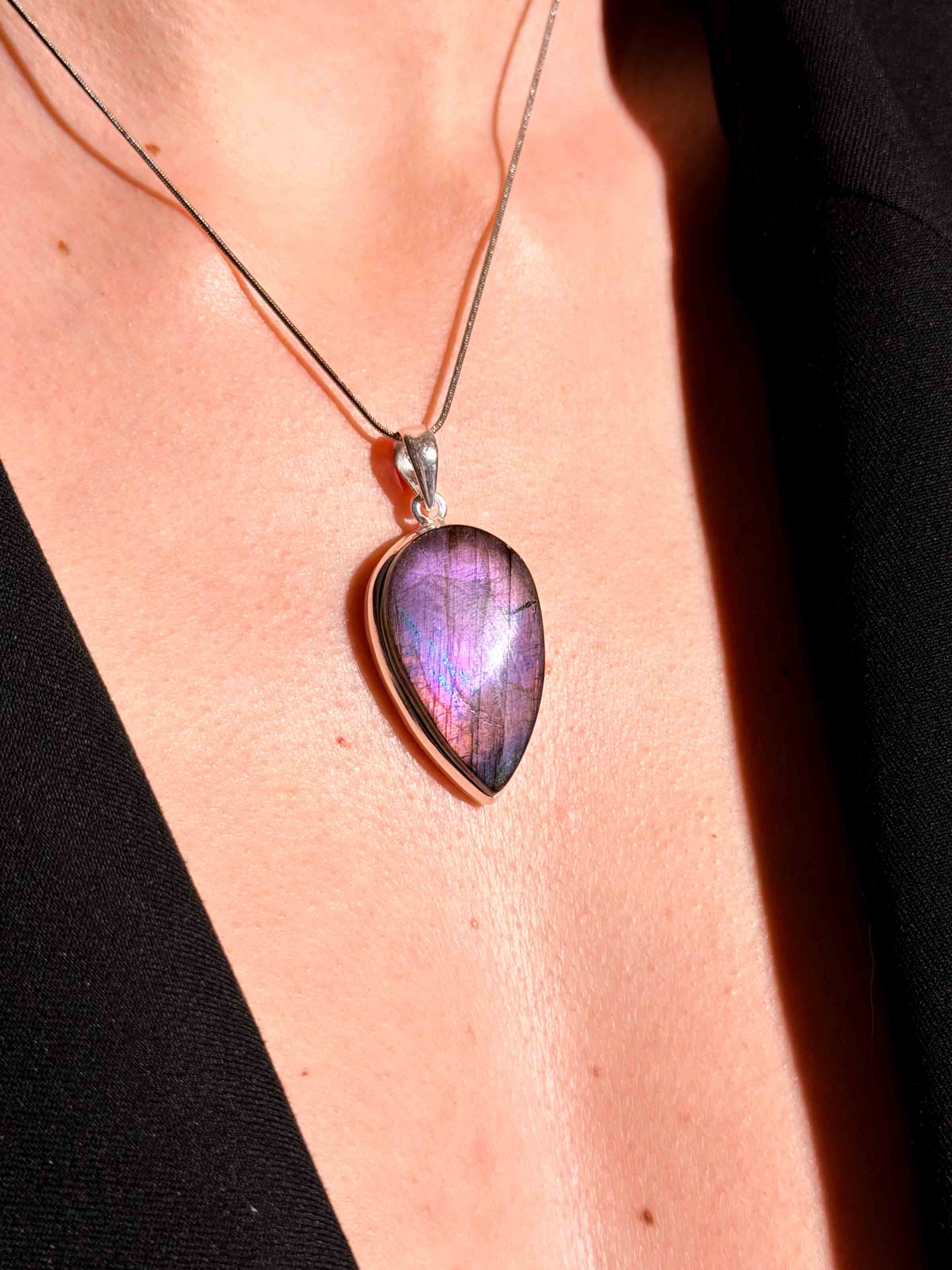 Εντυπωσιάστε με ένα κόσμημα που μαγνητίζει το βλέμμα. Αυτό το χειροποίητο μενταγιόν φιλοξενεί έναν σπάνιο, φυσικό Μωβ Λαβραδορίτη σε δάκρυ κοπή. Η επιφάνειά του κρύβει ένα εντυπωσιακό παιχνίδι χρωμάτων, όπου το βαθύ μωβ συναντά βιολετί και ροζ ανταύγειες καθώς το φως πέφτει πάνω του. Το στιβαρό και λιτό δέσιμο από ασήμι 925 αναδεικνύει το μέγεθος και τη μοναδικότητα του λίθου, καθιστώντας το ένα κομμάτι με πραγματική παρουσία.
