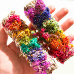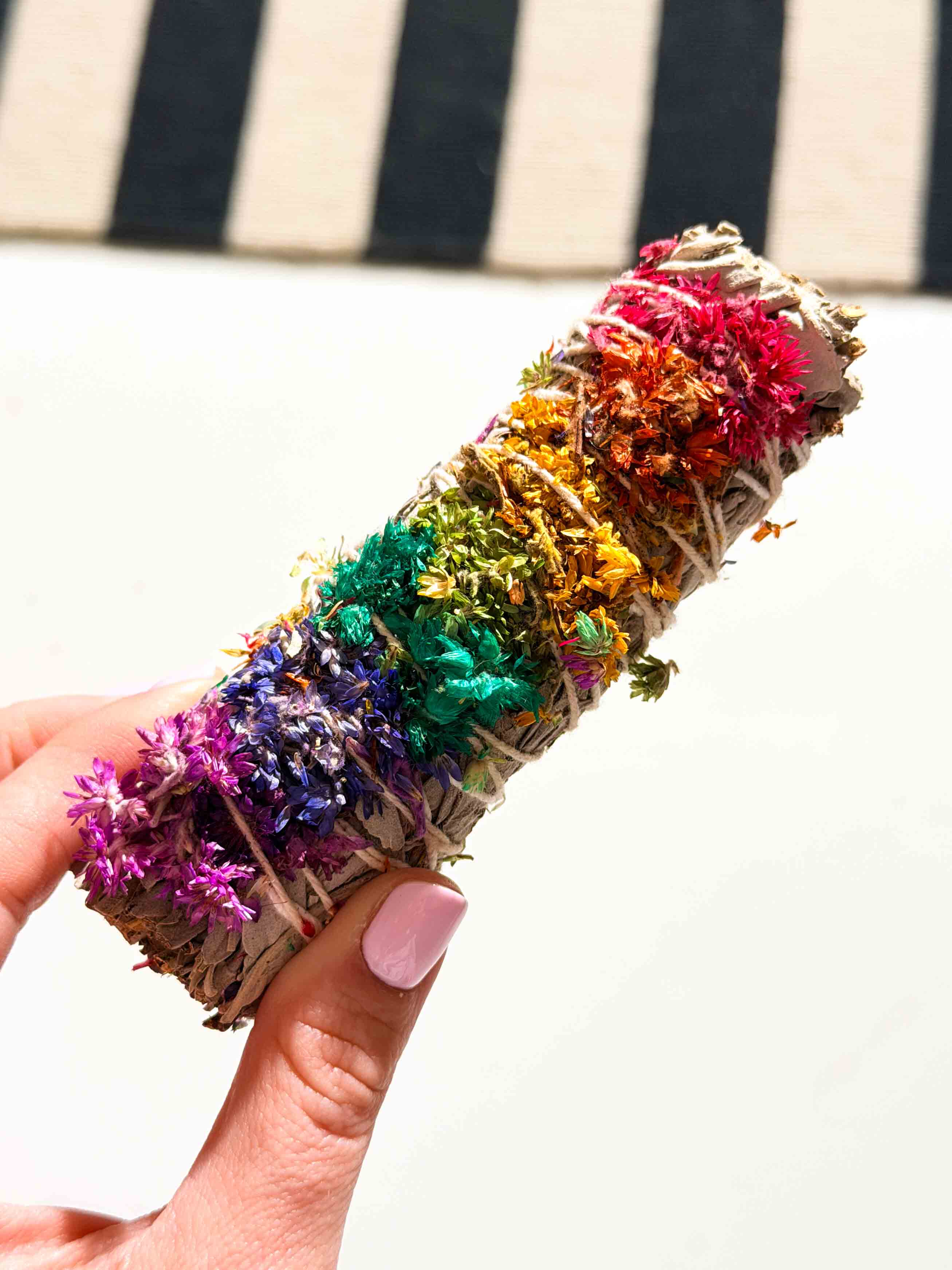 Αναβαθμίστε την καθημερινή σας πρακτική πνευματικού καθαρισμού με τη δέσμη Λευκού Φασκόμηλου Καλιφόρνιας, διακοσμημένη με πολύχρωμα άνθη που αντιπροσωπεύουν τα 7 κέντρα ενέργειας (Τσάκρα) του σώματος.